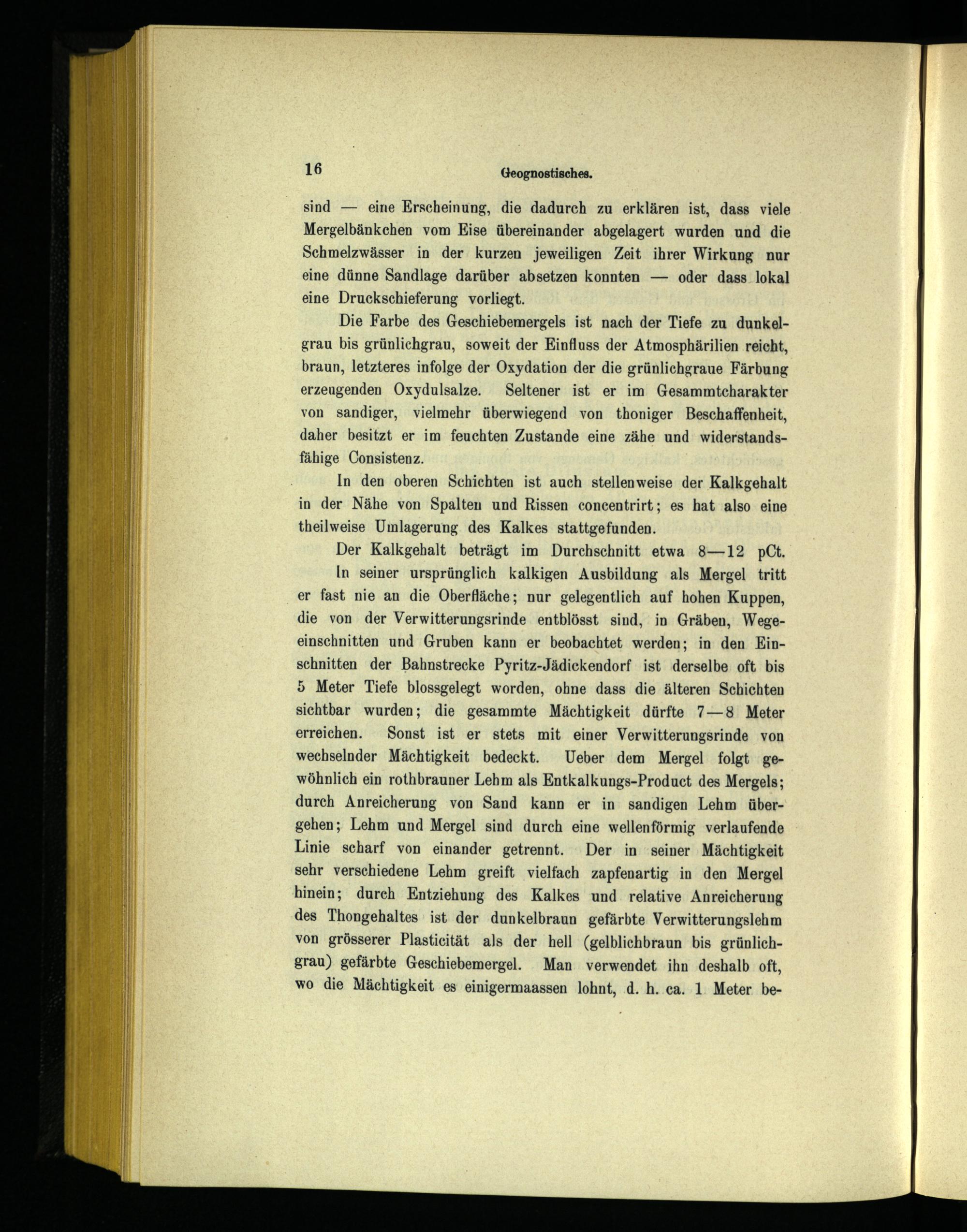 In seiner ursprünglich kalkigen Ausbildung als Mergel tritt er fast nie an die Oberfläche; nur gelegentlich auf hohen Kuppen, die von der Verwitterungsrinde entblösst sind, in Gräben, Wegeeinschnitten und Gruben kann er beobachtet werden; in den Einschnitten der Bahnstrecke Pyritz -Jädiekendorf ist derselbe oft bis 5 Meter Tiefe blossgelegt worden, ohne dass die älteren Schichten sichtbar wurden; die gesammte Mächtigkeit dürfte 7—8 Meter erreichen. Sonst ist er stets mit einer Verwitterungsrinde von wechselnder Mächtigkeit bedeckt. Ueber dem Mergel folgt gewöhnlich ein rothbrauner Lehm als Entkalkungs-Product des Mergels; durch Anreicherung von Sand kann er in sandigen Lehm übergehen; Lehm und Mergel sind durch eine wellenförmig verlaufende Linie scharf von einander getrennt. Der in seiner Mächtigkeit sehr verschiedene Lehm greift vielfach zapfenartig in den Mergel hinein; durch Entziehung des Kalkes und. relative Anreicherung des Thongehaltes ist der dunkelbraun gefärbte Verwitterungslehm von grösserer Plasticität als der hell(gelblichbraun bis grünlichgrau) gefärbte Geschiebemergel. Man verwendet ihn deshalb oft, wo die Mächtigkeit es einigermaassen lohnt, d. h. ca. 1. Meter be