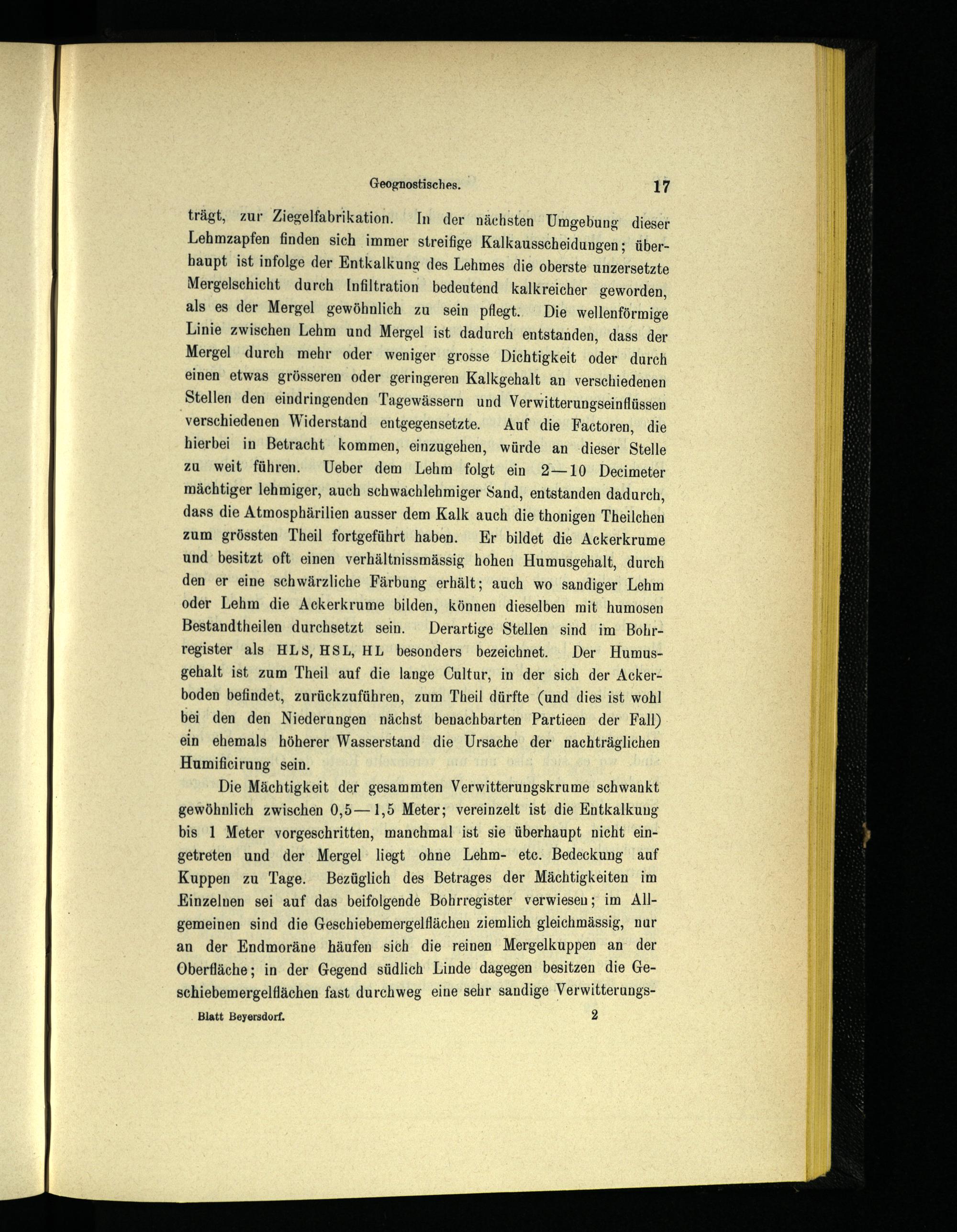 Bestandtheilen durchsetzt sein. Derartige Stellen sind im Bohrregister als HLS, HSL, HL besonders bezeichnet. Der Humusgehalt ist zum Theil auf die lange Cultur, in der sich der Ackerboden befindet, zurückzuführen, zum Theil dürfte(und dies ist wohl bei den den Niederungen nächst benachbarten Partieen der Fall) ein ehemals höherer Wasserstand die Ursache der nachträglichen