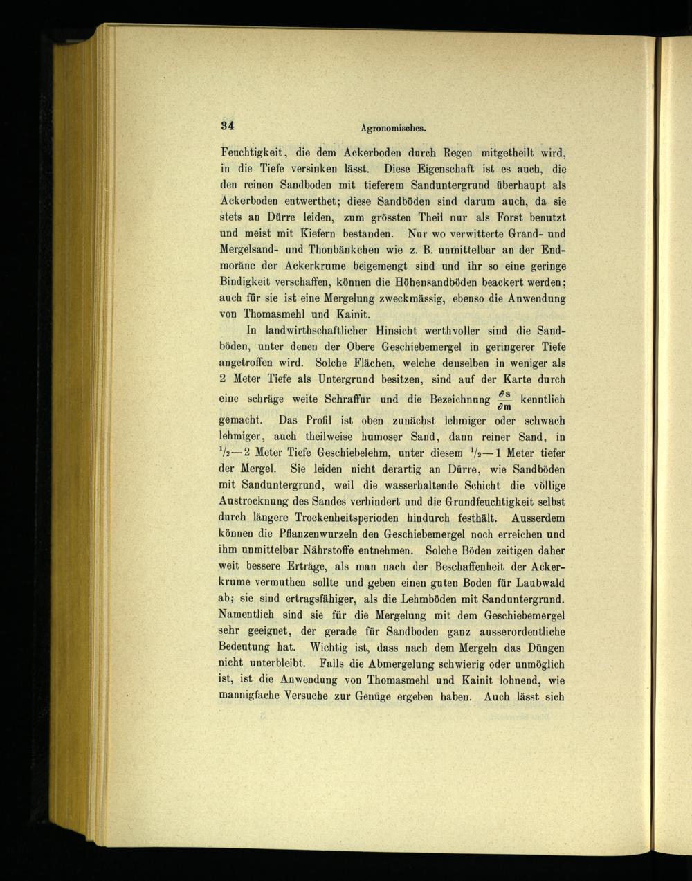 Feuchtigkeit, die dem Ackerboden durch Regen mitgetheilt wird, in die Tiefe versinken lässt. Diese Eigenschaft ist es auch, die den reinen Sandboden mit tieferem Sanduntergrund überhaupt als Ackerboden entwerthet; diese Sandböden sind darum auch, da, sie stets an Dürre leiden, zum grössten Theil nur als Forst benutzt und meist mit Kiefern bestanden. Nur wo verwitterte Grand- und Mergelsand- und Thonbänkchen wie z. B. unmittelbar an der Endmoräne der Ackerkrume beigemengt sind und ihr so eine geringe Bindigkeit verschaffen, können die Höhensandböden beackert werden; auch für sie ist eine Mergelung zweckmässig, ebenso die Anwendung von Thomasmehl und Kainit.