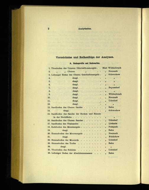 . Thonboden des Unteren Diluvialthonmergels.. Blatt Wildenbruch ®„ Oberen».“»„ Neumark . Lehmiger Boden des Oberen Geschiebemergels.» Schwochow desgl..» desgl.» desgl..” desgl.: Beyersdorf desgl.. PM desgl.. Wildenbruch desgl.« Neumark desgl.. Uchtdorf desgl. n” . Sandboden des Oberen Sandes....... Bahn desgl. KU ln al Schwochow . Sandboden des Sandes der Becken und Rinnen in der Hochfläche‘. VEN>» . Sandboden des Oberen Sandes......- Uchtdorf ‚ Sandboden des Thalsandes.... 0. Löcknitz . Kalkboden des Moormergels......... Podejuch desgl. 02 Au Bahn . Humusboden des Moormergels......-. Neumark desgl. KA Fiddichow . Humusboden der Moorerde......'. Uchtdorf . Humusboden des Torfes......,... Bahn desgl. KR» . Thonboden des Schlicks...... 1... Uchtdorf . Lehmiger Boden der Abschlemmmassen.. Bahn