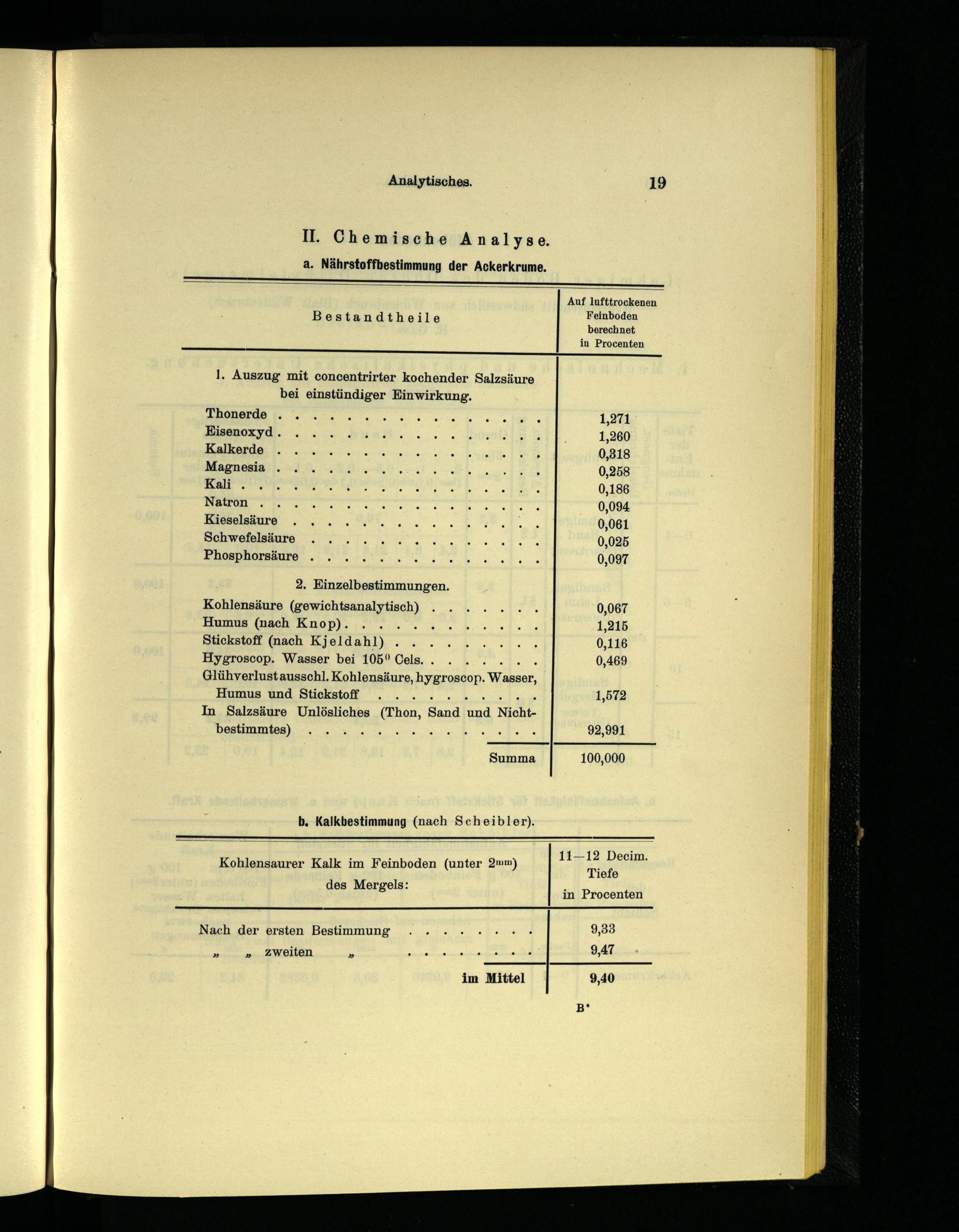 Kohlensäure(gewichtsanalytisch)....... 0,067 Humus(nach Knop).:.;...... 3... 1,215 Stickstoff(nach Kjeldahl)......... 0,116 Hygroscop. Wasser bei 105° Cels........ 0,469 Glühverlust ausschl. Kohlensäure, hygroscop. Wasser,