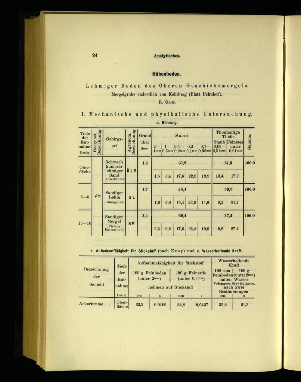 Tiefe Aufnahmefähigkeit für Stickstoff Wessehaltende .. 100 ccm 100 g der en 100 g Feinboden| 100 g Heinerde Feinboden(unter 2mm) Ent-(unter 2mm)|(unter 0,5mm) halten Wasser ; Volumproc.|Gewichtsproc. Schicht nahme nehmen auf Stickstoff nach zwei Bestimmungen ccm| g ccm g 32,8 0,0406| 34,8/ 0,0437| 82,8| 21,3 U