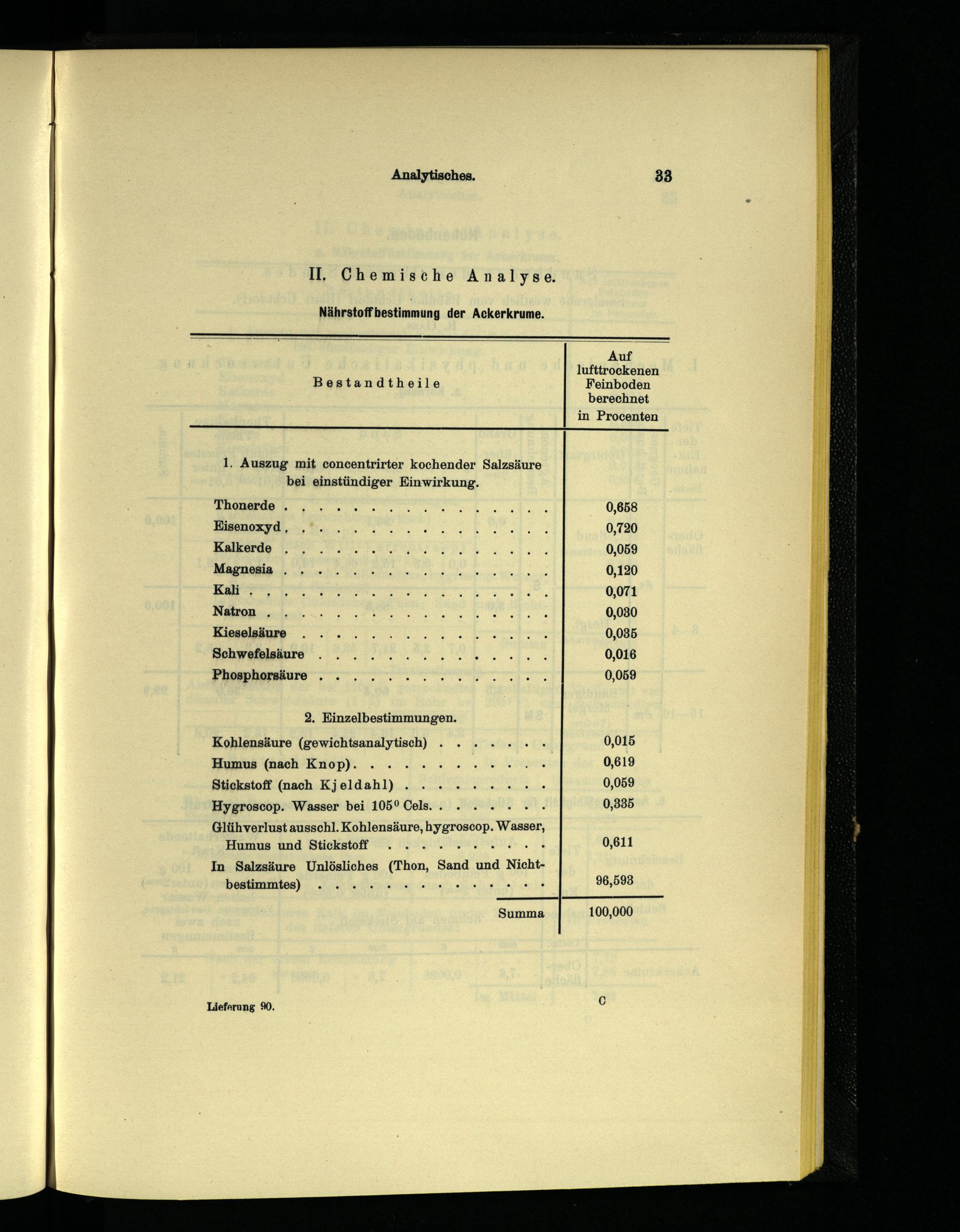 Kohlensäure(gewichtsanalytisch)...... 0,015 Humus(nach Knop).... 0,619 Stickstoff(nach Kjeldahl).........+. 0,059 Hygroscop. Wasser bei 105° Cels.......- 0,335 Glühverlust ausschl. Kohlensäure, hygroscop. Wasser, Humus und Stickstoff... 40h In Salzsäure Unlösliches(Thon, Sand und Nichtbestimmtes) U