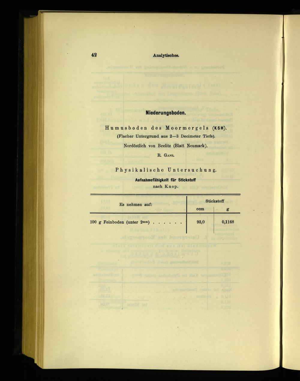 Niederungsboden. Humusboden des Moormergels(KSH). (Flacher Untergrund aus 2—3 Decimeter Tiefe). Nordöstlich von Beelitz (Blatt Neumark ). R. Gans, Physikalische Untersuchung. Aufnahmefähigkeit für Stickstoff nach Knop. Stickstoff Es nehmen auf: cem| 100 g Feinboden(unter 2mm),