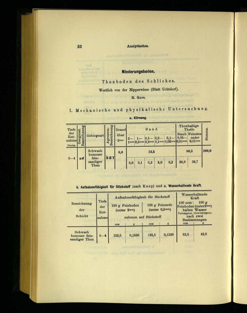 a. Körnung. N Thonhalti Den Grand*“ Sand N eheilo 9 er Ent-——_____———— 1 Staub|Feinstes nahme 10,5—|0,2—| 0,1—| 0,05—/| unter | 0,2mm 0,1mm 0,05mm(0,01mm/ 0,01mm Decim. Schwach humoser|. 13,5 86,5 100,0 3—4| ast fein- HST sandiger Thon 0,2| 5,0| 8,2| 26,8 59,7