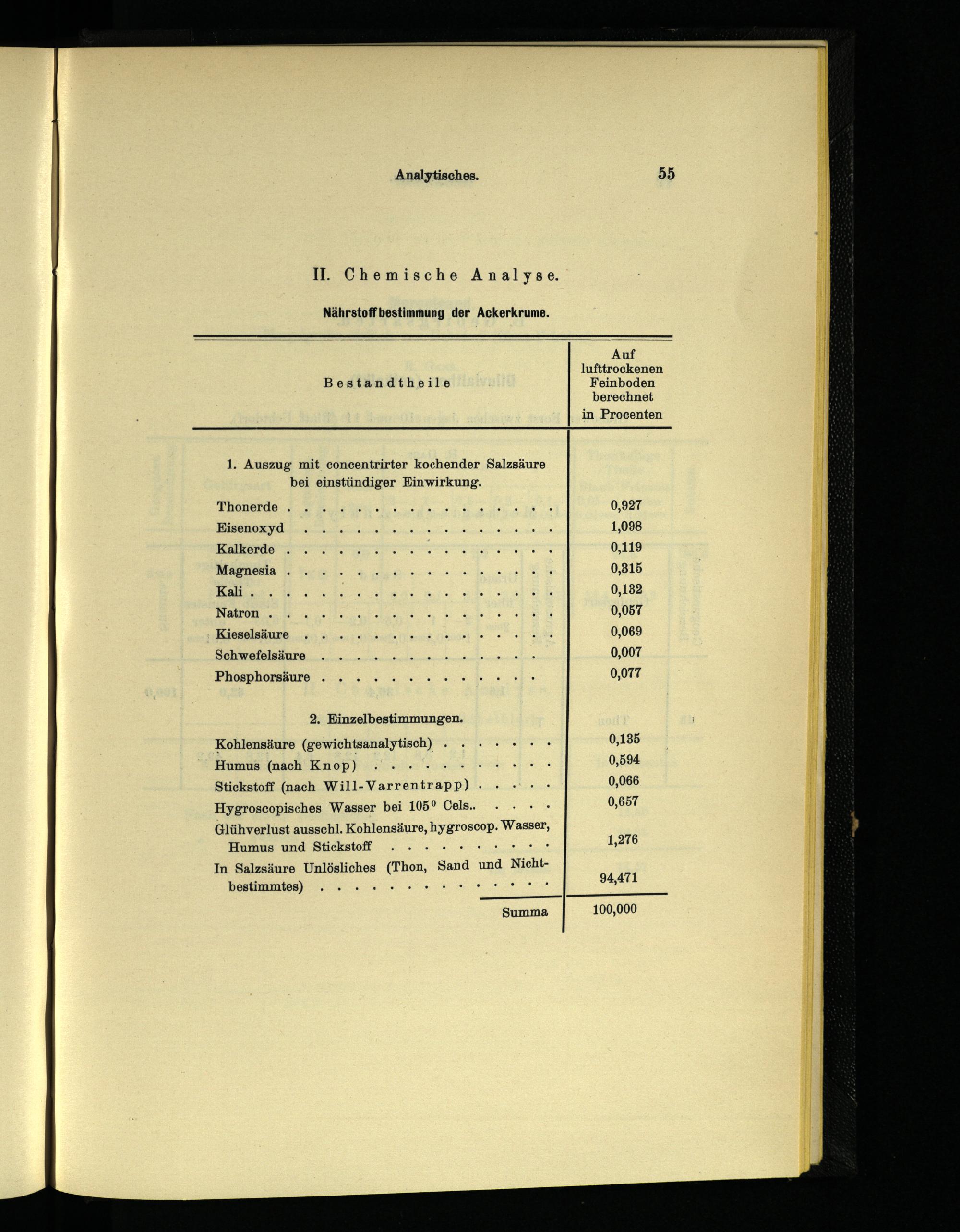 1. Auszug mit concentrirter kochender Salzsäure bei einstündiger Einwirkung. Thonerde. Eisenoxyd Kalkerde Magnesia. Kali. Natron. Kieselsäure Schwefelsäure Phosphorsäure.