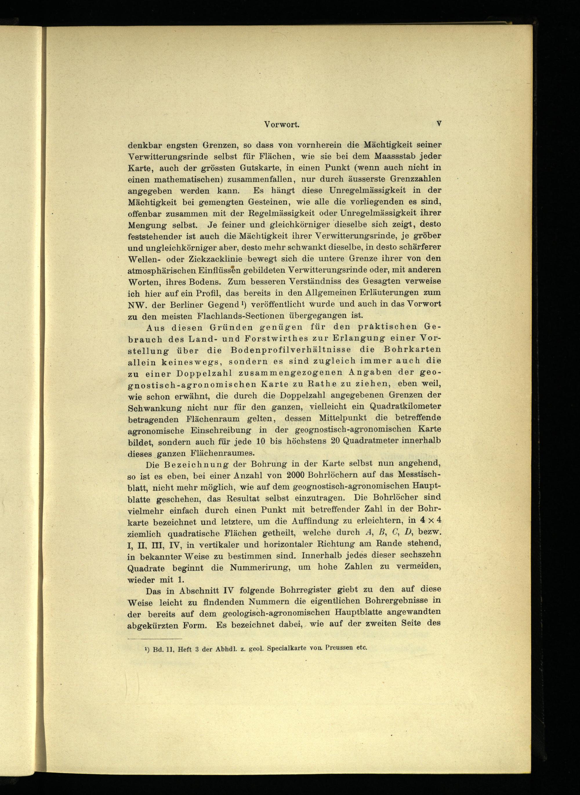 denkbar engsten Grenzen, so dass von vornherein die Mächtigkeit seiner Verwitterungsrinde selbst für Flächen, wie sie bei dem Maassstab jeder Karte, auch der grössten Gutskarte, in einen Punkt(wenn auch nicht in einen mathematischen) zusammenfallen, nur durch äusserste Grenzzahlen angegeben werden kann. Es hängt diese Unregelmässigkeit in der Mächtigkeit bei gemengten Gesteinen, wie alle die vorliegenden es sind, offenbar zusammen mit der Regelmässigkeit oder Unregelmässigkeit ihrer Mengung selbst. Je feiner und gleichkörniger dieselbe sich zeigt, desto feststehender ist auch die Mächtigkeit ihrer Verwitterungsrinde, je gröber und ungleichkörniger aber, desto mehr schwankt dieselbe, in desto schärferer Wellen- oder Zickzacklinie bewegt sich die untere Grenze ihrer von den atmosphärischen Einflüssen gebildeten Verwitterungsrinde oder, mit anderen Worten, ihres Bodens. Zum besseren Verständniss des Gesagten verweise ich hier auf ein Profil, das bereits in den Allgemeinen Erläuterungen zum NW. der Berliner Gegend!) veröffentlicht wurde und auch in das Vorwort zu den meisten Flachlands-Sectionen übergegangen ist.
