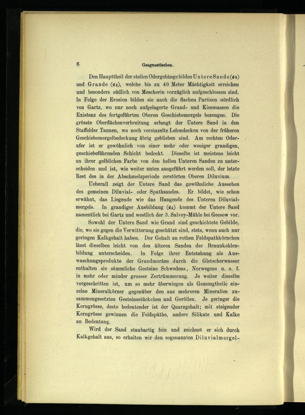 Den Haupttheil der steilen Odergehänge bilden Untere Sande(ds) und Grande(dg), welche bis zu 40 Meter Mächtigkeit erreichen und besonders südlich von Mescherin vorzüglich aufgeschlossen sind. In Folge der Erosion bilden sie auch die flachen Partieen nördlich von Gartz , wo nur noch aufgelagerte Grand- und Kiesmassen die Existenz des fortgeführten Oberen Geschiebemergels bezeugen. Die grösste Oberflächenverbreitung erlangt der Untere Sand in den Staffelder Tannen, wo noch vereinzelte Lehmdecken von der früheren Geschiebemergelbedeckung übrig geblieben sind. Am rechten Oderufer ist er gewöhnlich von einer mehr oder weniger grandigen, geschiebeführenden Schicht bedeckt. Dieselbe ist meistens leicht an ihrer gelblichen Farbe von den hellen Unteren Sanden zu unterscheiden und ist, wie weiter unten ausgeführt werden soll, der letzte Rest des in der Absechmelzperiode zerstörten Oberen Diluvium.