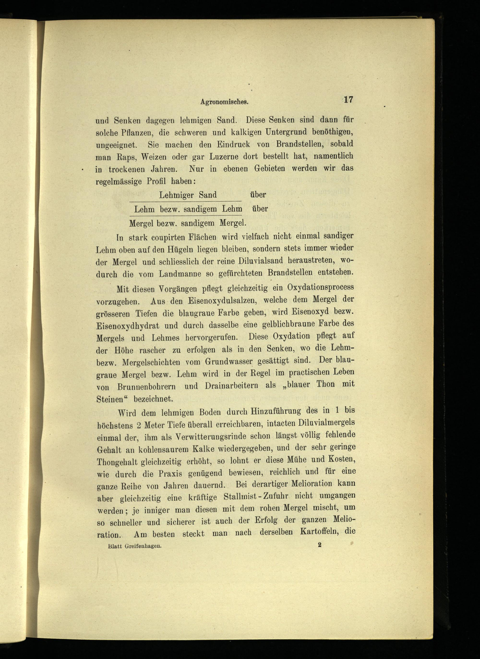 Wird dem lehmigen Boden durch Hinzuführung des in 1 bis höchstens 2 Meter Tiefe überall erreichbaren, intacten Diluvialmergels einmal der, ihm als Verwitterungsrinde schon längst völlig fehlende Gehalt an kohlensaurem Kalke wiedergegeben, und der sehr geringe Thongehalt gleichzeitig erhöht, so lohnt er diese Mühe und Kosten, wie durch die Praxis genügend bewiesen, reichlich und für eine ganze Reihe von Jahren dauernd. Bei derartiger Melioration kann aber gleichzeitig eine kräftige Stallmist- Zufuhr- nicht umgangen werden; je inniger man diesen mit dem rohen Mergel mischt, um so schneller und sicherer ist auch der Erfolg der ganzen Melioration... Am besten steckt man nach derselben Kartoffeln, die