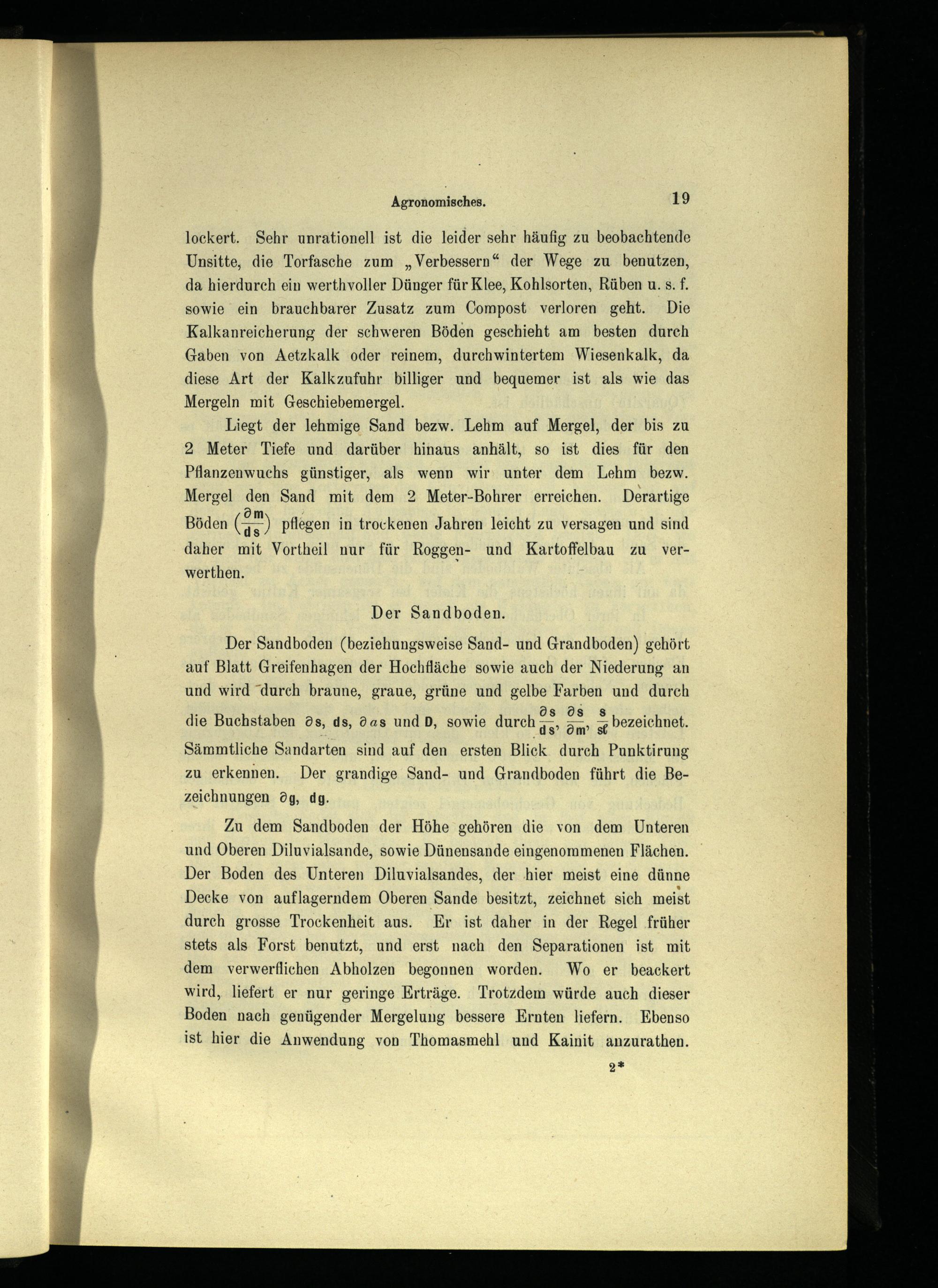 Liegt der lehmige Sand bezw. Lehm auf Mergel , der bis zu 2 Meter Tiefe und darüber hinaus anhält, so ist dies für den Pflanzenwuchs günstiger, als wenn wir unter dem Lehm bezw. Mergel den Sand mit dem 2 Meter-Bohrer erreichen. Derartige Böden Ca pflegen in trockenen Jahren leicht zu versagen und sind daher mit Vortheil nur für Roggen- und Kartoffelbau zu verwerthen.