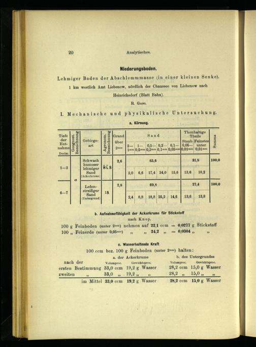 b. Aufnahmefähigkeit der Ackerkrume für Stickstoff nach Knop.} 100 g Feinboden(unter 2mm) nehmen auf 22,1 ccm 0,0277 g Stickstoff 100„ Feinerde(unter 0,05mm) ,,„R42 ,, 0,0304 ,,»