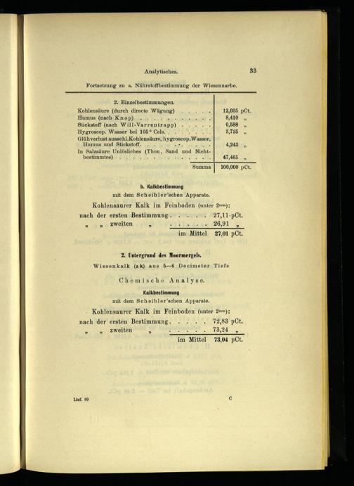 Kohlensäure(durch directe Wägung)..... 12,035 pCt. Humus(nach Knop)....: En 8,410 Stickstoff(nach Will- Yarrentrapp) Wk 0,588 Hygroscop. Wasser bei 105° Cels...... 3,725 Glühverlust ausschl.Kohlensäure, hygr: OROnP Wasser