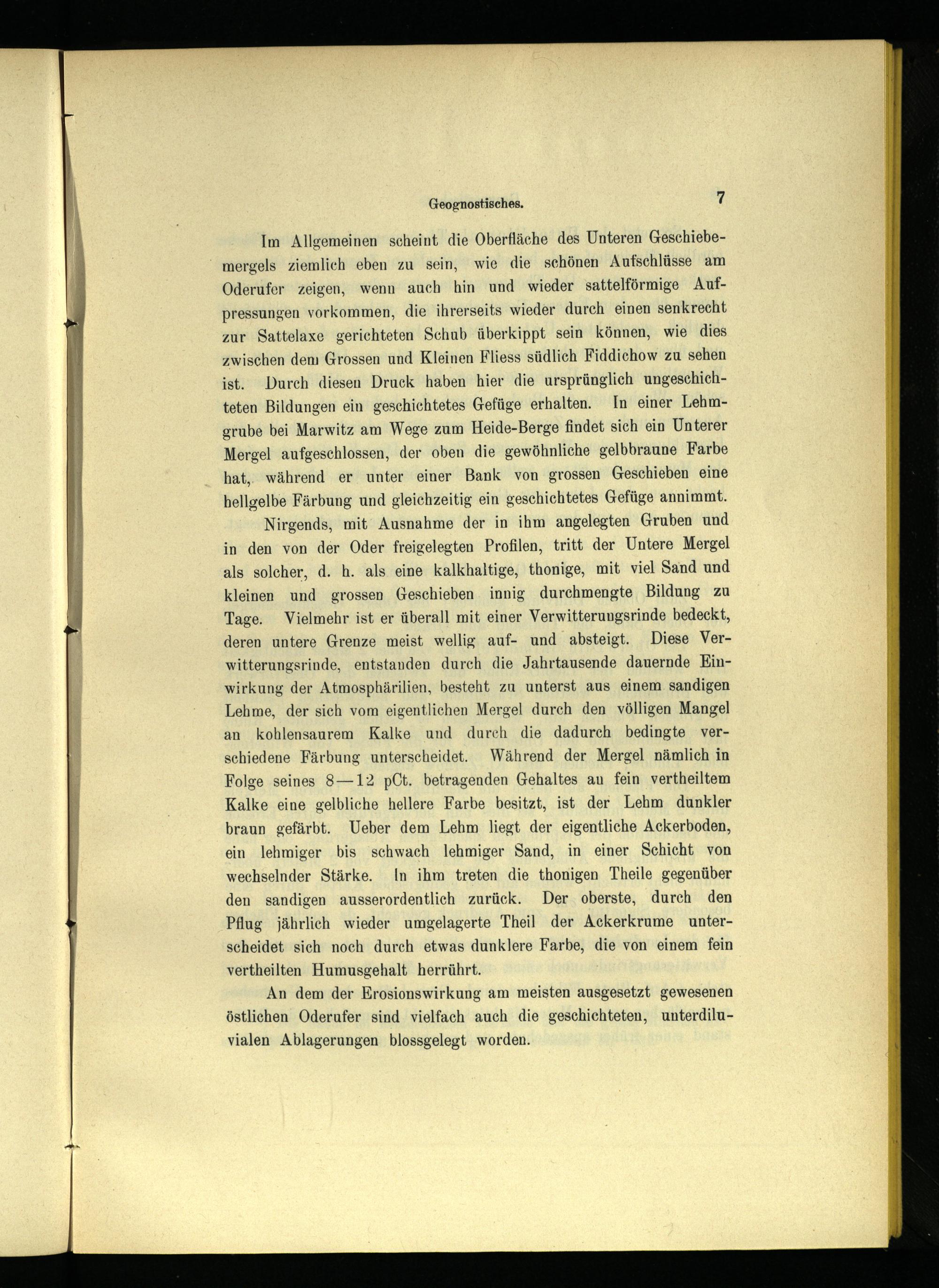 Im Allgemeinen scheint die Oberfläche des Unteren Geschiebemergels ziemlich eben zu sein, wie die schönen Aufschlüsse am Oderufer zeigen, wenn auch hin und wieder sattelförmige Aufpressungen vorkommen, die ihrerseits wieder durch einen senkrecht zur Sattelaxe gerichteten Schub überkippt sein können, wie dies zwischen dem Grossen und Kleinen Fliess südlich Fiddichow zu sehen ist. Durch diesen Druck haben hier die ursprünglich ungeschichteten Bildungen ein geschichtetes Gefüge erhalten. In einer Lehmgrube bei Marwitz am Wege zum Heide-Berge findet sich ein Unterer Mergel aufgeschlossen, der oben die gewöhnliche gelbbraune Farbe hat, während er unter einer Bank von grossen Geschieben eine hellgelbe Färbung und gleichzeitig ein geschichtetes Gefüge annimmt.