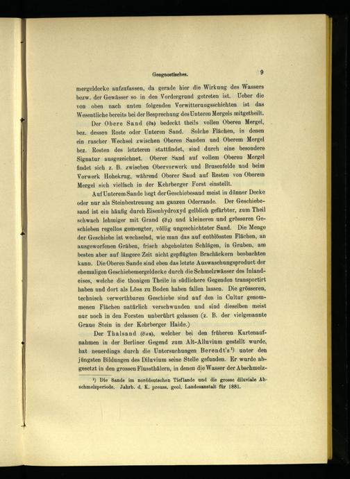 Der Thalsand(das), welcher bei den früheren Kartenaufnahmen in der Berliner Gegend zum Alt-Alluvium gestellt wurde, hat neuerdings durch die Untersuchungen Berendt’s*) unter den jüngsten Bildungen des Diluvium seine Stelle gefunden. Er wurde abgesetzt in den grossen Flussthälern, in denen die Wasser der Abschmelz