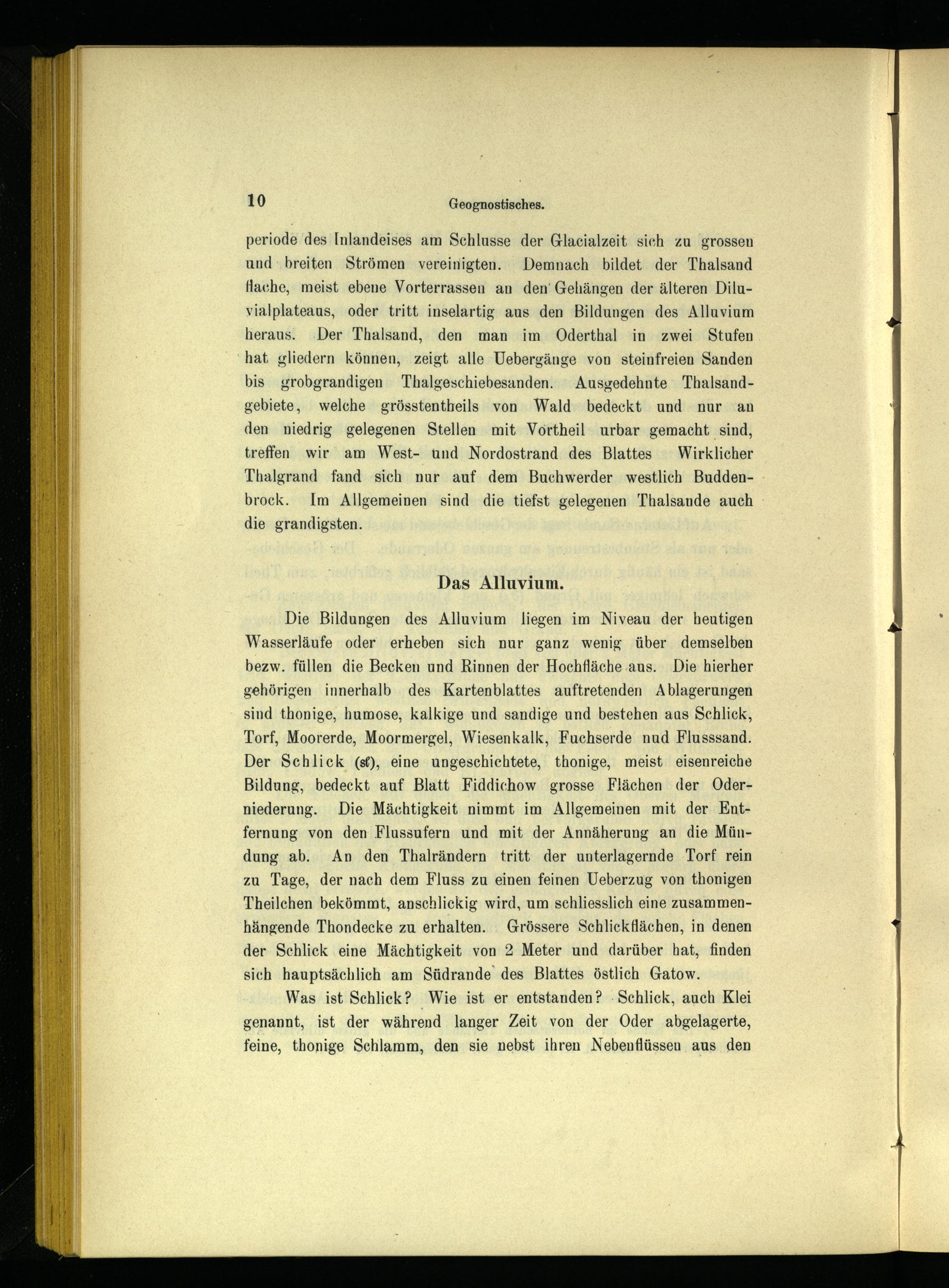 Die Bildungen des Alluvium liegen im Niveau der heutigen Wasserläufe oder erheben sich nur ganz wenig über demselben bezw. füllen die Becken und Rinnen der Hochfläche aus. Die hierher gehörigen innerhalb des Kartenblattes auftretenden Ablagerungen sind thonige, humose, kalkige und sandige und bestehen aus Schlick, Torf, Moorerde, Moormergel, Wiesenkalk, Fuchserde nud Flusssand. Der Schlick(st), eine ungeschichtete, thonige, meist eisenreiche Bildung, bedeckt auf Blatt Fiddichow grosse Flächen der Oderniederung. Die Mächtigkeit nimmt im Allgemeinen mit der Entfernung von den Flussufern und mit der Annäherung an die Mündung ab. An den Thalrändern tritt der unterlagernde Torf rein zu Tage, der nach dem Fluss zu einen feinen Ueberzug von thonigen Theilchen bekömmt, anschlickig wird, um schliesslich eine zusammenhängende Thondecke zu erhalten. Grössere Schlickflächen, in denen der Schlick eine Mächtigkeit von 2 Meter und darüber hat, finden sich hauptsächlich am Südrande des Blattes östlich Gatow .