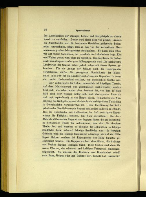 das Ausschneiden der strengen Lehm- und Mergelköpfe zu diesem Zweck zu empfehlen. Leider wird hierin noch viel gefehlt. Anstatt ein. Ausschneiden der für bestimmte Gewächse geeigneten Bodenarten vorzunehmen, pflegt man an den von den Vorbesitzern übernommenen graden Schlaggrenzen festzuhalten. So kann man sehen, wie auf reinem Sandboden, der innerhalb des Lehmbodens liegt, Klee und Weizen gesäet wird, ohne zu bedenken, dass hierdurch die Bodenrente heruntergesetzt oder ganz in Frage gestellt wird. Die intelligenten Landwirthe der Gegend haben jedoch schon mit diesem System gebrochen. Für die Anlage der Schläge nach den Untergrundsverhältnissen dürfte die geologische Specialkarte im Maassstabe 1:25 000 für die Landwirthschaft solcher Gegenden, in denen