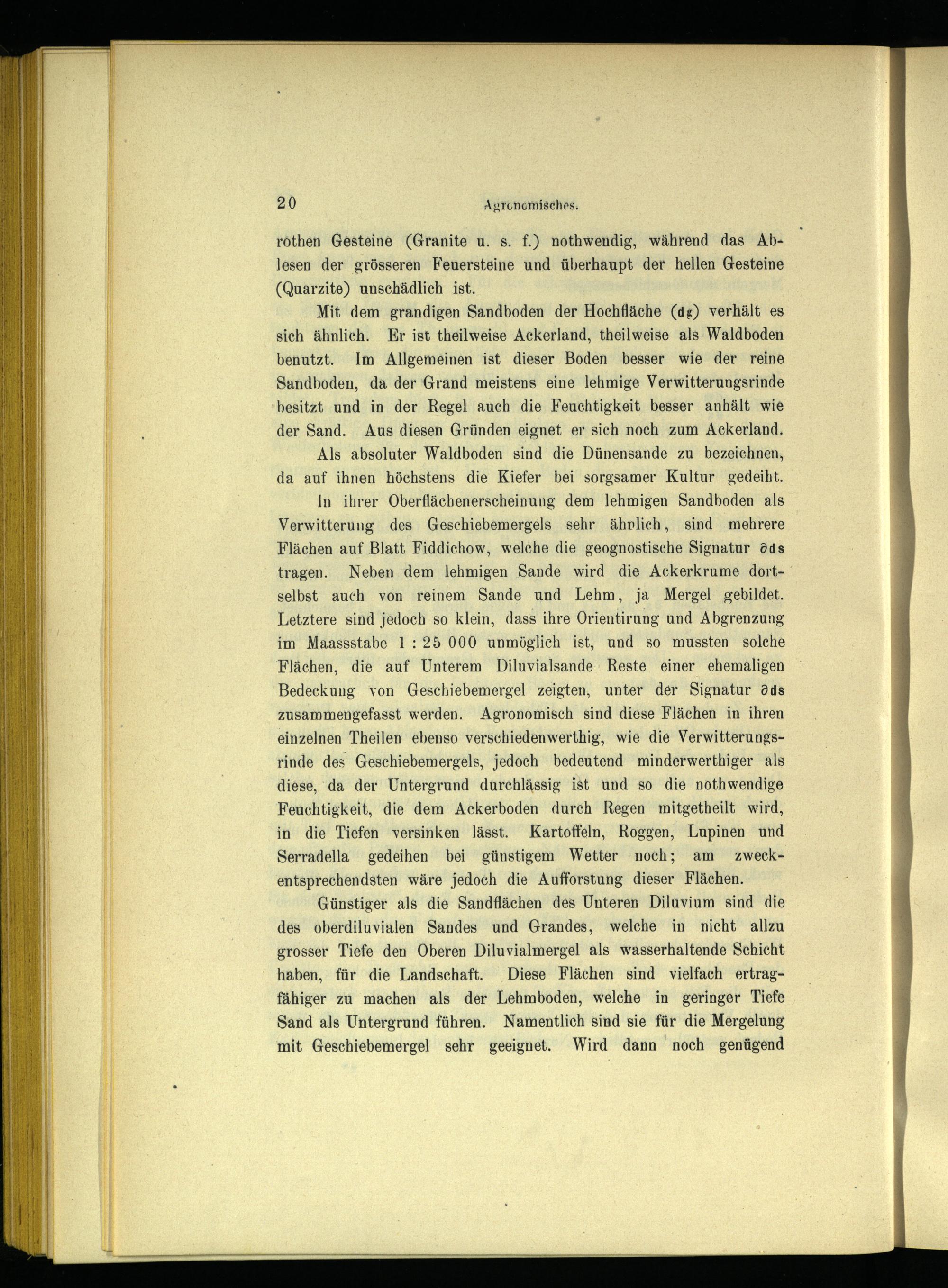 In ihrer Oberflächenerscheinung dem lehmigen Sandboden als Verwitterung des Geschiebemergels sehr ähnlich, sind mehrere Flächen auf Blatt Fiddichow , welche die geognostische Signatur dds tragen. Neben dem lehmigen Sande wird die Ackerkrume dortselbst auch von reinem Sande und Lehm, ja Mergel gebildet. Letztere sind jedoch so klein, dass ihre Orientirung und Abgrenzung im Maassstabe 1:25 000 unmöglich ist, und so mussten solche Flächen, die auf Unterem Diluvialsande Reste einer ehemaligen Bedeckung von Geschiebemergel zeigten, unter der Signatur öds zusammengefasst werden. Agronomisch sind diese Flächen in ihren einzelnen Theilen ebenso verschiedenwerthig, wie die Verwitterungsrinde des Geschiebemergels, jedoch bedeutend minderwerthiger als diese, da der Untergrund durchlässig ist und so die nothwendige Feuchtigkeit, die dem Ackerboden durch Regen mitgetheilt wird, in die Tiefen versinken lässt. Kartoffeln, Roggen, Lupinen und Serradella gedeihen bei günstigem Wetter noch; am zweckentsprechendsten wäre jedoch die Aufforstung dieser Flächen.