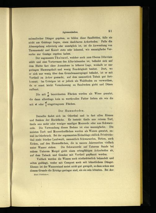 Der sogenannte Thalsand, welcher noch zum Oberen Diluvium zählt und eine Vorterrasse des Alluvialsandes ist, befindet sich auf dem Blatte fast ohne Ausnahme in höherer Lage, weshalb er nur geringen Humusgehalt und wenig Feuchtigkeit besitzt. Dort, wo er sich nur wenig über dem Grundwasserspiegel befindet, ist er mit Vortheil zu Acker gemacht, auf dem namentlich Tabak gut fortkommt. Im Uebrigen ist er jedoch als Waldboden zu verwerthen, da er sonst leicht Veranlassung zu Sandwehen giebt und Dünen aufbaut.
