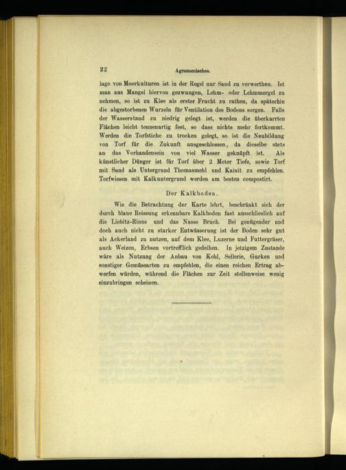 Wie die Betrachtung der Karte lehrt, beschränkt sich der durch blaue Reissung erkennbare Kalkboden fast ausschlieslich auf die Liebitz-Rinne und das Nasse Bruch. Bei genügender und doch auch nicht zu starker Entwässerung ist der Boden sehr gut als Ackerland zu nutzen, auf dem Klee, Luzerne und Futtergräser, auch Weizen, Erbsen vortrefflich gedeihen. In jetzigem Zustande wäre als Nutzung der Anbau von Kohl, Sellerie, Gurken und
