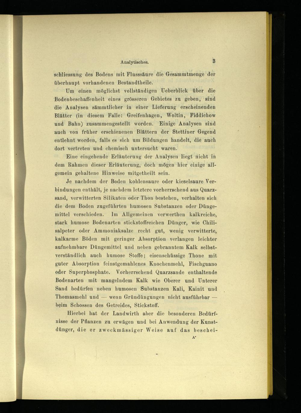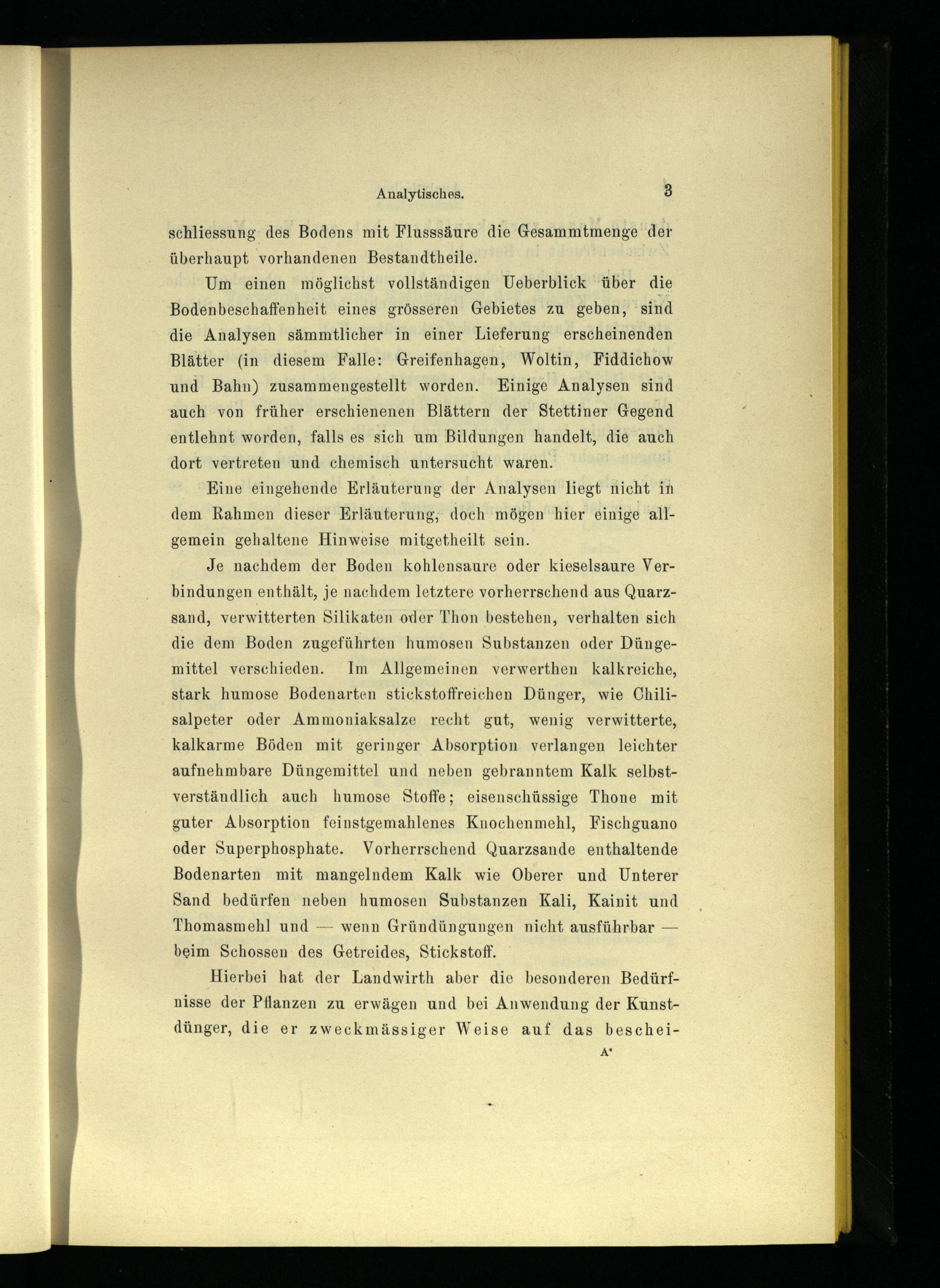 Um einen möglichst vollständigen Ueberblick über die Bodenbeschaffenheit eines grösseren Gebietes zu geben, sind die Analysen sämmtlicher in einer Lieferung erscheinenden Blätter(in diesem Falle: Greifenhagen , Woltin, Fiddichow und Bahn) zusammengestellt worden. Einige Analysen sind auch von früher erschienenen Blättern der Stettiner Gegend entlehnt worden, falls es sich um Bildungen handelt, die auch dort vertreten und chemisch untersucht waren.