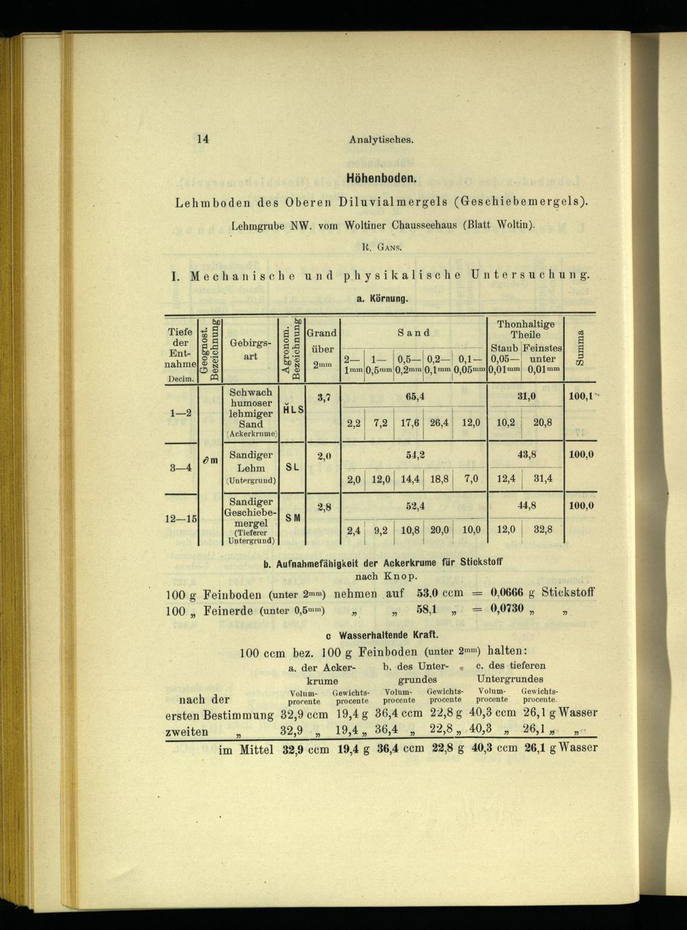 b. Aufnahmefähigkeit der Ackerkrume für Stickstoff nach Knop.;| 100 g Feinboden(unter 23mm) nehmen ‚auf 53,0 ccm 0,0666 x Stickstoff 100„ Feinerde(unter 0,5m) RE„08.10 0,0730,”
