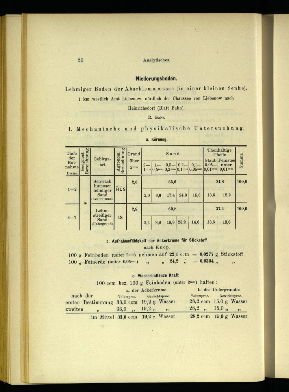 b. Aufnahmefähigkeit der Ackerkrume für Stickstoff nach Knop. 100 g Feinboden(unter 2m) nehmen auf 22,1 ccm 0,0277 g Stickstoff 100„„ Feinerde(unter 0,05mm) ,,„ 242,= 0,0304,» ; c. Wasserhaltende Kraft 100 ccm bez. 100 g Feinboden(unter 2mm) halten: