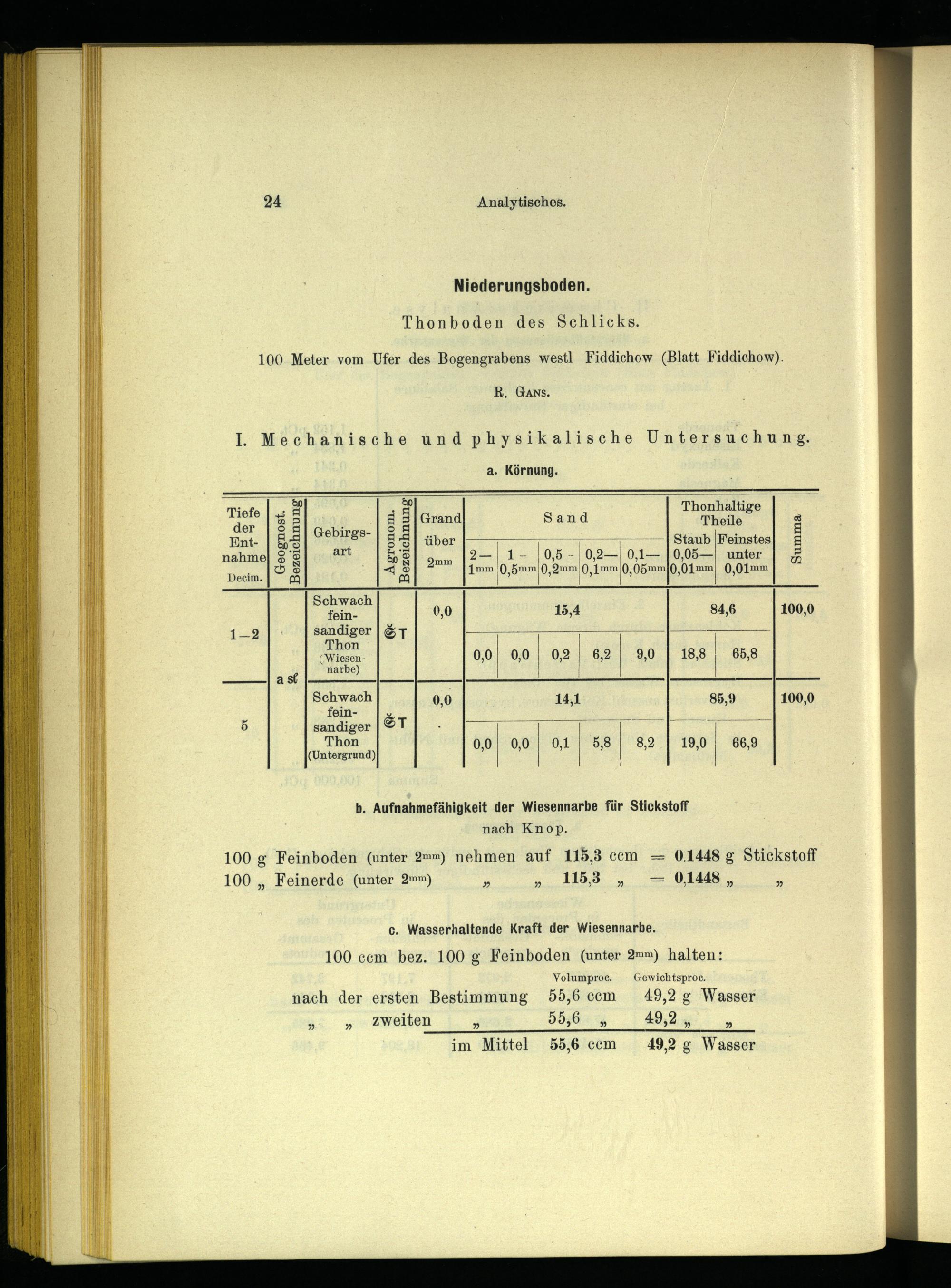 b. Aufnahmefähigkeit der Wiesennarbe für Stickstoff nach Knop. 100 g Feinboden(unter 2mm) nehmen auf 115,3 ccm 0.1448 g Stickstoff 100„ Feinerde(unter 2mm) 5 2 115,8 0,1448»