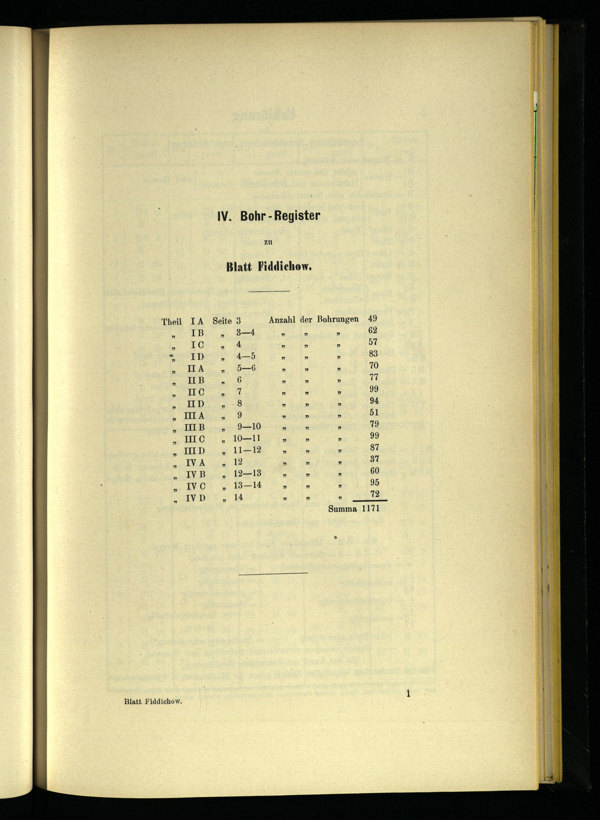 IV. Bohr-Register zu Blatt Fiddichow . IA Seite 3 Anzahl der Bohrungen 49 TB 62 IC; 57 ID 83 IA 70 HB 7 IC 99 HD- 94 IHIA 51 HB 79 HC 99 HID 87 IVA 37 IVB 60 IvC 95 IVD 72 ——— Summa 1171 Blatt Fiddichow .