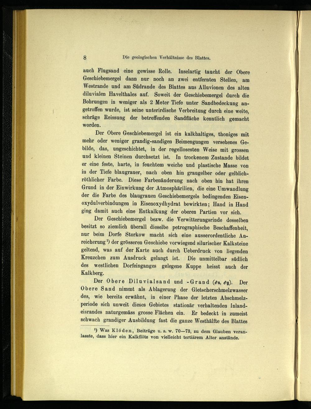 Der Geschiebemergel bezw. die Verwitterungsrinde desselben besitzt so ziemlich überall dieselbe petrographische Beschaffenheit, nur beim Dorfe Storkow macht sich eine ausserordentliche Anreicherung') der grösseren Geschiebe vorwiegend silurischer Kalksteine geltend, was auf der Karte auch durch Ueberdruck von liegenden Kreuzchen zum Ausdruck gelangt ist. Die unmittelbar südlich des westlichen Dorfeinganges gelegene Kuppe heisst auch der Kalkberg.