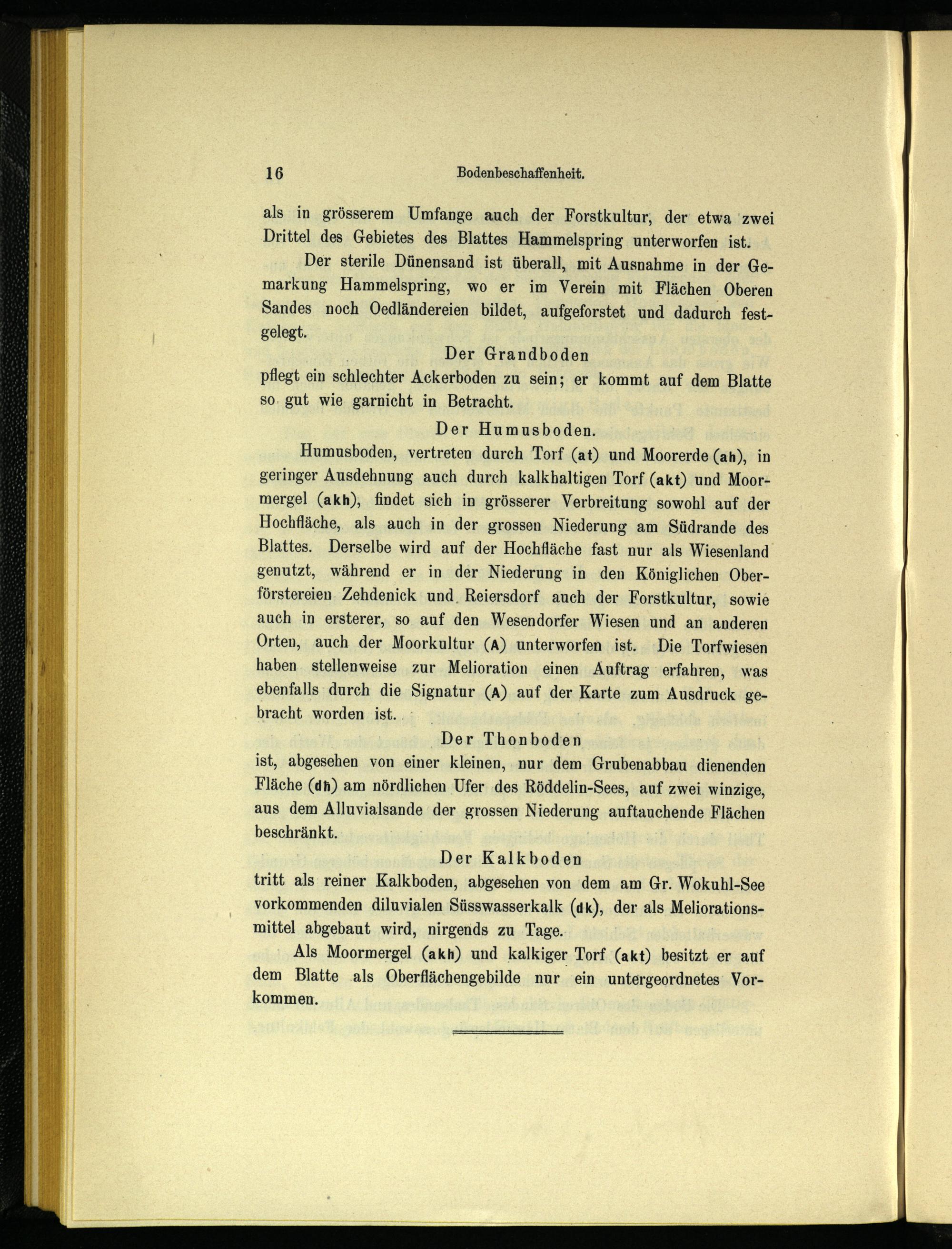 Humusboden, vertreten durch Torf(at) und Moorerde(ah), in geringer Ausdehnung auch durch kalkhaltigen Torf(akt) und Moormergel(akh), findet sich in grösserer Verbreitung sowohl auf der Hochfläche, als auch in der grossen Niederung am Südrande des Blattes. Derselbe wird auf der Hochfläche fast nur als Wiesenland genutzt, während er in der Niederung in den Königlichen Oberförstereien. Zehdenick und. Reiersdorf auch der Forstkultur, sowie auch in ersterer, so auf den Wesendorfer Wiesen und an anderen Orten, auch der Moorkultur(A) unterworfen ist. Die Torfwiesen haben stellenweise zur Melioration einen Auftrag- erfahren, was ebenfalls durch die Signatur(A) auf der Karte zum Ausdruck gebracht worden ist.