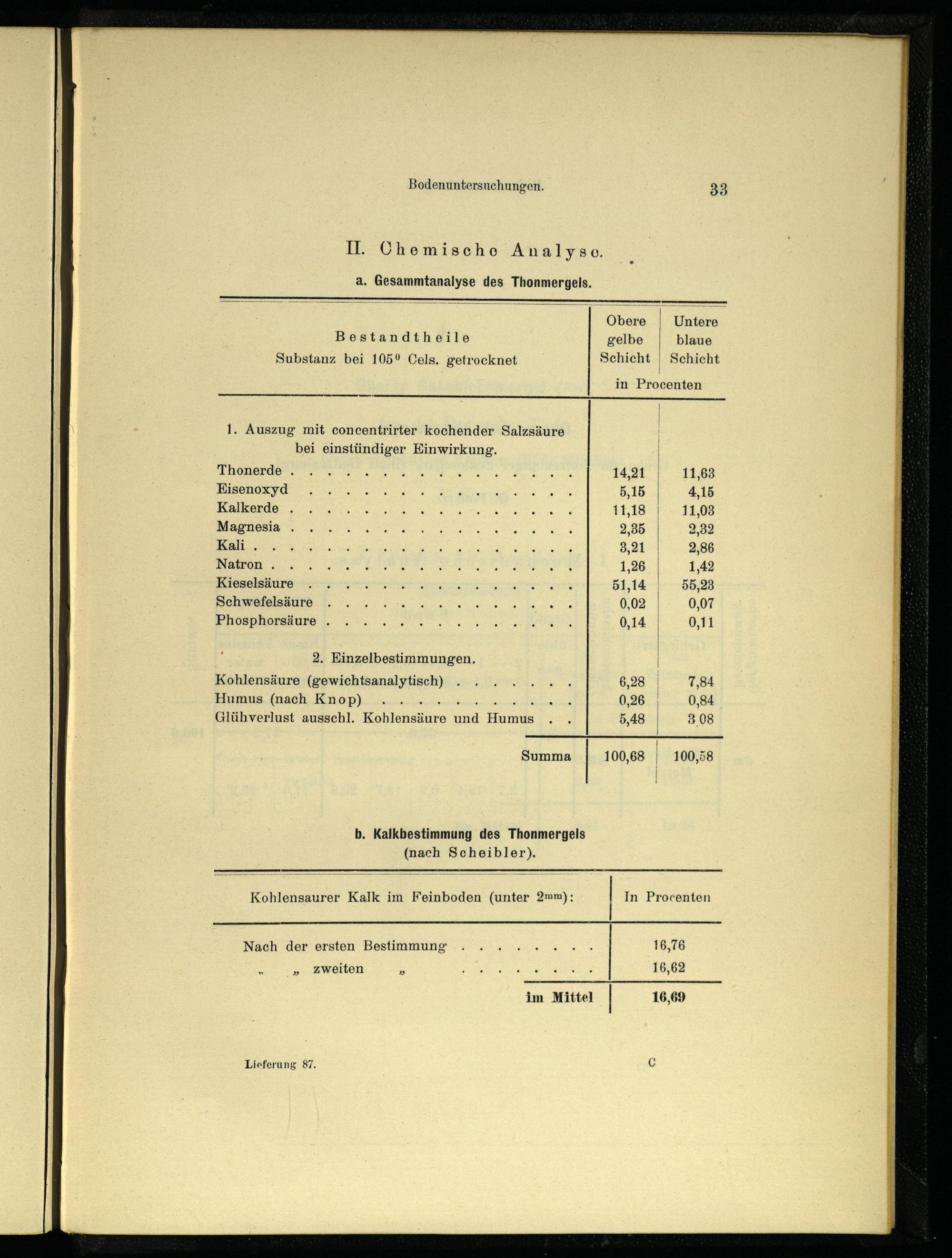 a. Gesammtanalyse des Thonmergels. Obere| Untere Bestandtheile gelbe| blaue Substanz bei 105% Cels. getrocknet Schicht| Schicht in Procenten Hu 1. Auszug mit concentrirter kochender Salzsäure bei einstündiger Einwirkung. Thonerde. Eisenoxyd Kalkerde. Magnesia. Kali. Natron. Kieselsäure Schwefelsäure Phosphorsäure.