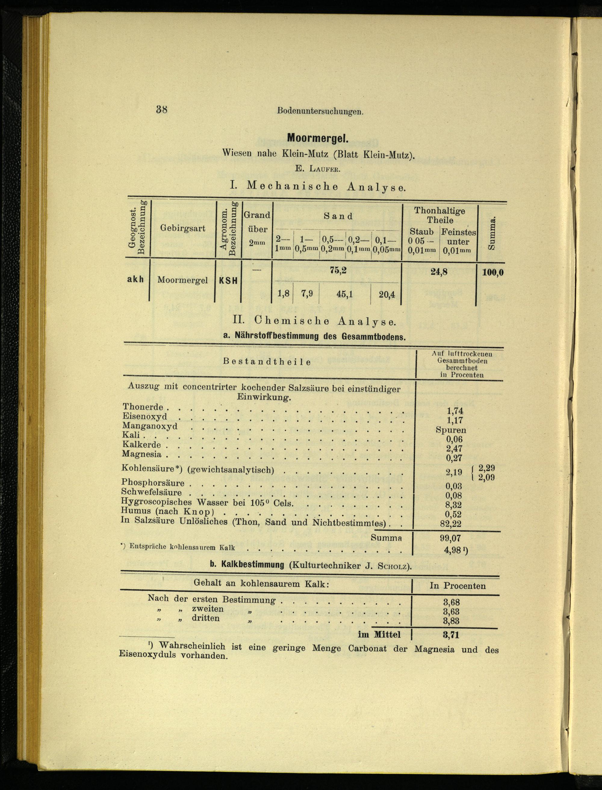 / 38 Bodenuntersuchungen. | Moormergel.| Wiesen nahe Klein-Mutz(Blatt Klein-Mutz).‘) E. LAUFER.| .|| I. Mechanische Analyse. A &&|*; ua ‚x. Thonhaltige Sa 5 5[Grand Sand Theile 5 56| Gebirgsart| SS| über|— er——[ Staub|Feinstes 6 $’8 eh 8 Qum 1211 To, Be 19, 2-|‘0,1 005-— ‚unter 5 SS A<$ 1mm 9% 5mm 0, ‚2m 0, ‚Tmm0, 05mm 0, 01mm| 9; 01mm ee il A BA N — 75,2 24,8 100,0 akh| Moormergel|KSH OD 18/ 7,9 45,1| 20,4 H. Chemische Analyse. a. 2: Wrsloflbesfimmung 4 des s_Besammtbonens. A N Auf TufttrockenenBestandtheile N RUOHNEE in EL NN 0 0 in Procenten | Auszug A concentrirter kochender Salzsäure bei einstündiger) Einwirkung..\ Thonerde. 1,74| Eisenoxyd 1,17 Manganoxyd Spuren Kali..:., 0,06 Kalkerde. 2,47 Magnesia. A 0,27 Kohlensäure*)(gewichtsanalytisch) 2,19{ 0 ’ Phosphorsäure. 0,08 Schwefelsäure. 0,08| Hygroscopisches Wasser bei 1050"Cele.‘ 8,32| Humus(nach Knop) 0,’52 In Salzsäure Unlösliches (Thon, Sand und Nichtbestimmtes). 89, 22