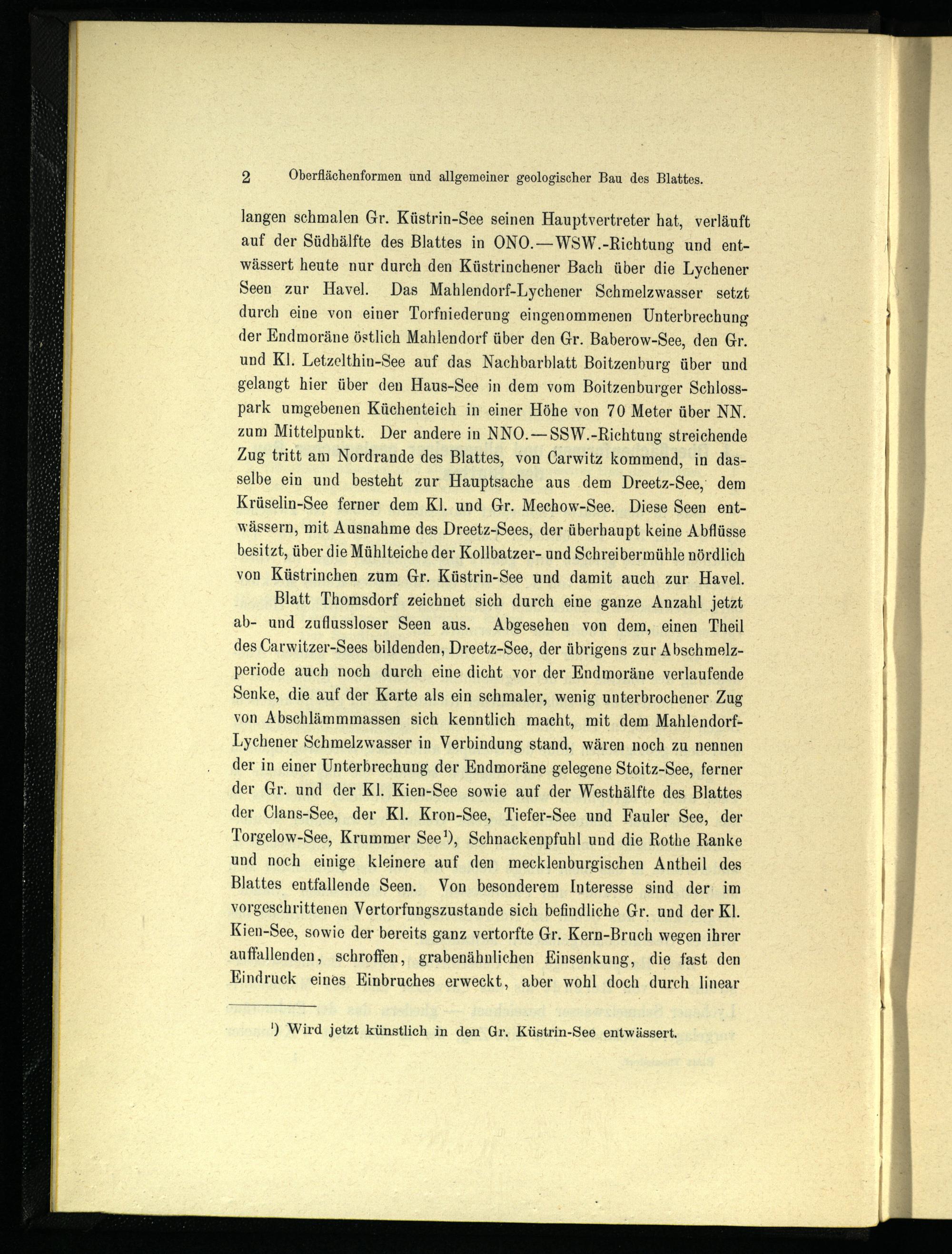 Blatt Thomsdorf zeichnet sich durch eine ganze Anzahl jetzt ab- und zuflussloser Seen aus. Abgesehen von dem, einen Theil des Carwitzer-Sees bildenden, Dreetz-See, der übrigens zur Abschmelzperiode auch noch durch eine dicht vor der Endmoräne verlaufende Senke, die auf der Karte als ein schmaler, wenig unterbrochener Zug von Abschlämmmassen sich kenntlich macht, mit dem MahlendorfLychener Schmelzwasser in Verbindung stand, wären noch zu nennen der in einer Unterbrechung der Endmoräne gelegene Stoitz-See, ferner der Gr. und der Kl. Kien-See sowie auf der Westhälfte des Blattes der Clans-See, der Kl. Kron-See, Tiefer-See und Fauler See, der Torgelow-See, Krummer See"), Schnaekenpfuhl und die Rothe Ranke und noch einige kleinere auf den mecklenburgischen Antheil des Blattes entfallende Seen. Von besonderem Interesse sind der im vorgeschrittenen Vertorfungszustande sich befindliche Gr. und der Kl. Kien-See, sowie der bereits ganz vertorfte Gr. Kern-Bruch wegen ihrer auffallenden, schroffen, grabenähnlichen Einsenkung, die fast den Eindruck eines Einbruches erweckt, aber wohl doch durch linear
