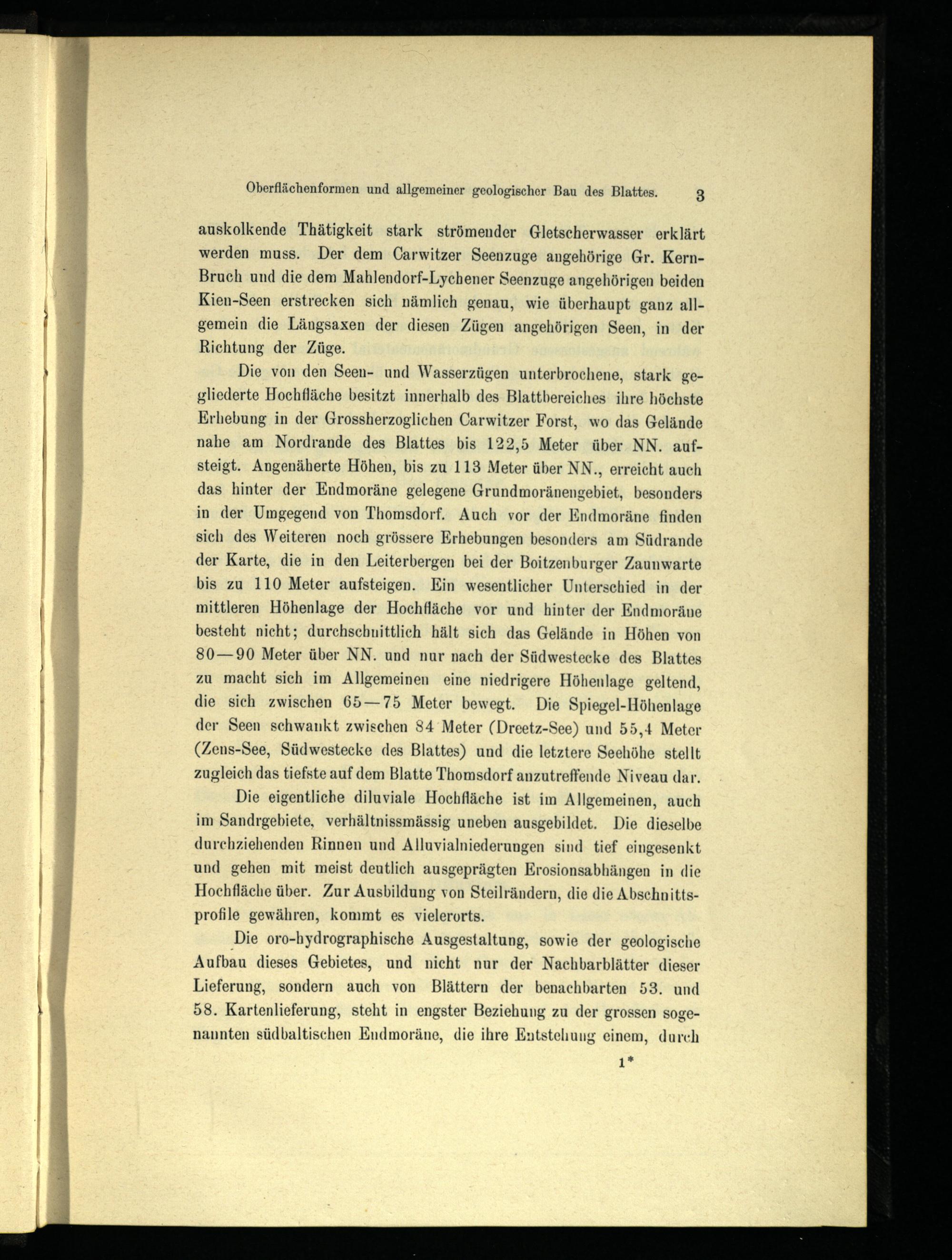Die oro-hydrographische Ausgestaltung, sowie der geologische Aufbau dieses Gebietes, und nicht nur der Nachbarblätter dieser Lieferung, sondern auch von Blättern der benachbarten 53. und 58. Kartenlieferung, steht in engster Beziehung zu der grossen sogenannten südbaltischen Endmoräne, die ihre Entstelıung einem, durch