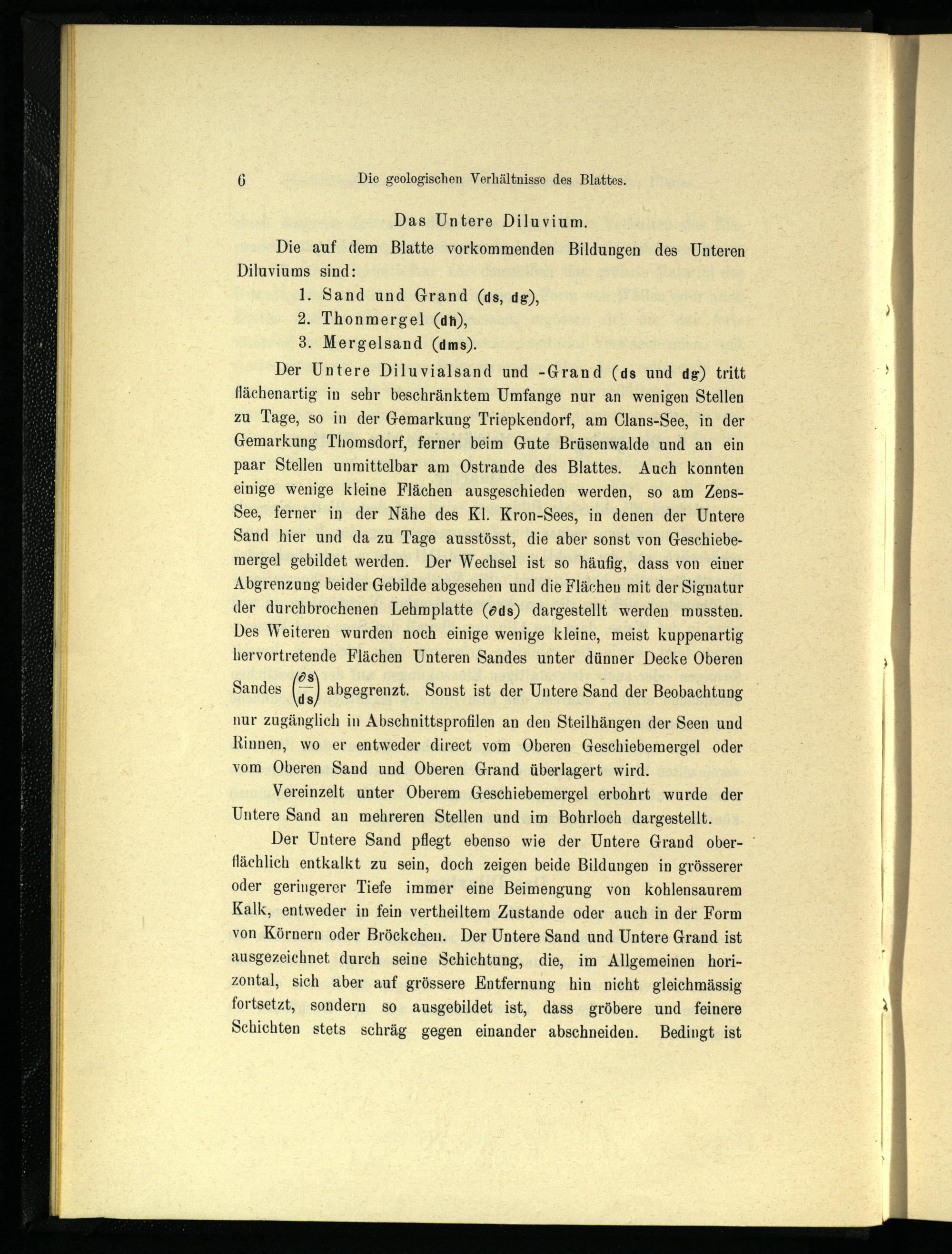 Der Untere Diluvialsand und-Grand(ds und dg) tritt flächenartig in sehr beschränktem Umfange nur an wenigen Stellen zu Tage, so in der Gemarkung Triepkendorf , am Clans-See, in der Gemarkung Thomsdorf, ferner beim Gute Brüsenwalde und an ein paar Stellen unmittelbar am Ostrande des Blattes. Auch konnten einige wenige kleine Flächen ausgeschieden werden, so am ZensSee, ferner in der Nähe des Kl. Kron-Sees, in denen der Untere Sand hier und da zu Tage ausstösst, die aber sonst von Geschiebemergel gebildet werden. Der Wechsel ist so häufig, dass von einer Abgrenzung beider Gebilde abgesehen und die Flächen mit der Signatur der durchbrochenen Lehmplatte(öds) dargestellt werden mussten. Des Weiteren wurden noch einige wenige kleine, meist kuppenartig hervortretende Flächen Unteren Sandes unter dünner Decke Oberen