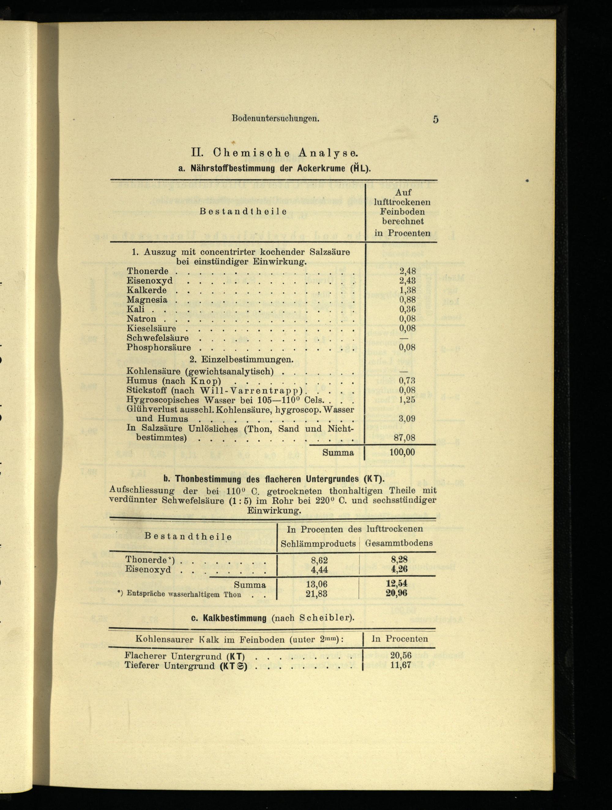 b. Thonbestimmung des flacheren Untergrundes(KT). Aufschliessung der bei 110% C. getrockneten thonhaltigen Theile mit verdünnter Schwefelsäure(1:5) im Rohr bei 220° C. und sechsstündiger