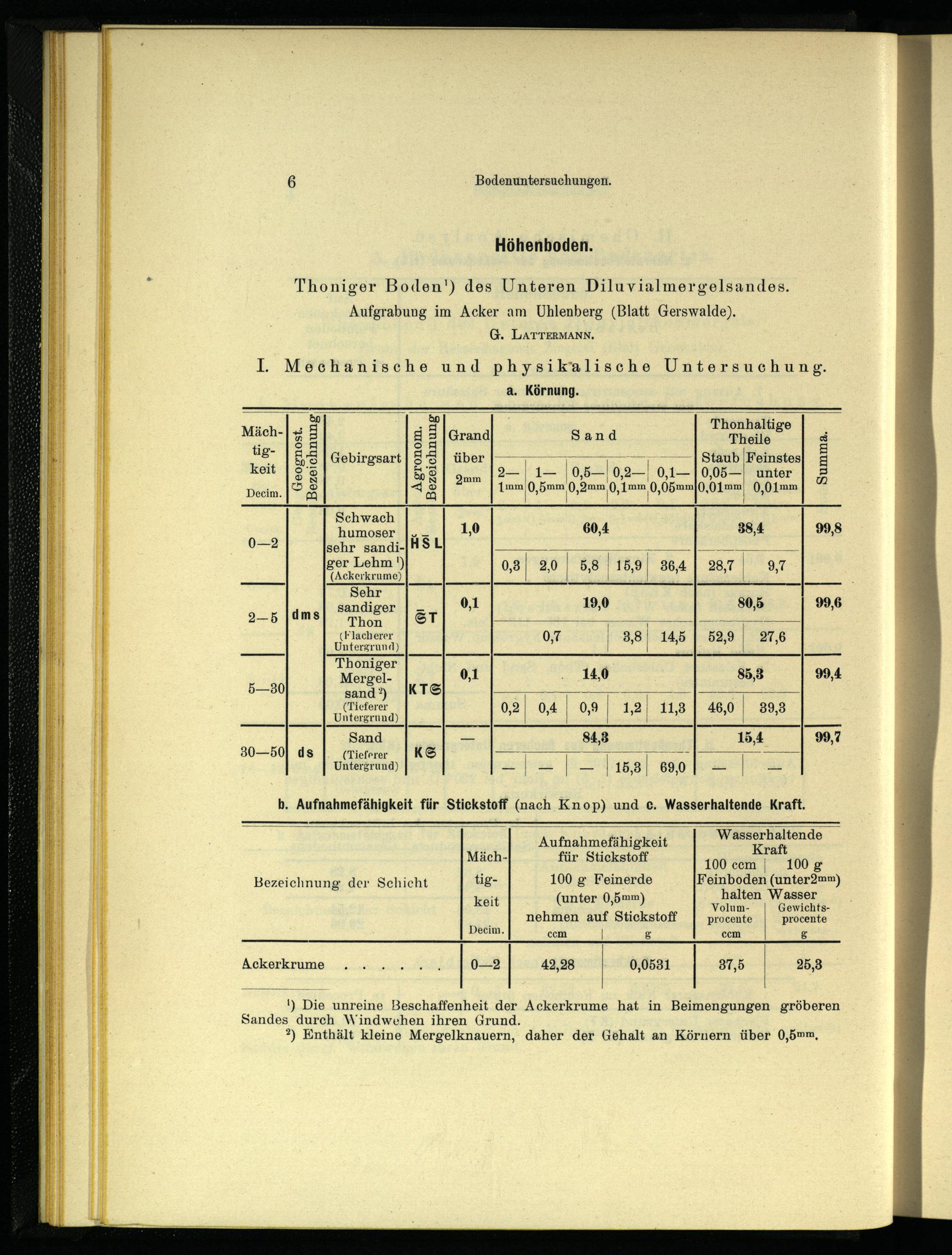 ') Die unreine Beschaffenheit der Ackerkrume hat in Beimengungen gröberen Sandes durch Windwehen ihren Grund. ?) Enthält kleine Mergelknauern, daher der Gehalt an Körnern über 0,5mm,