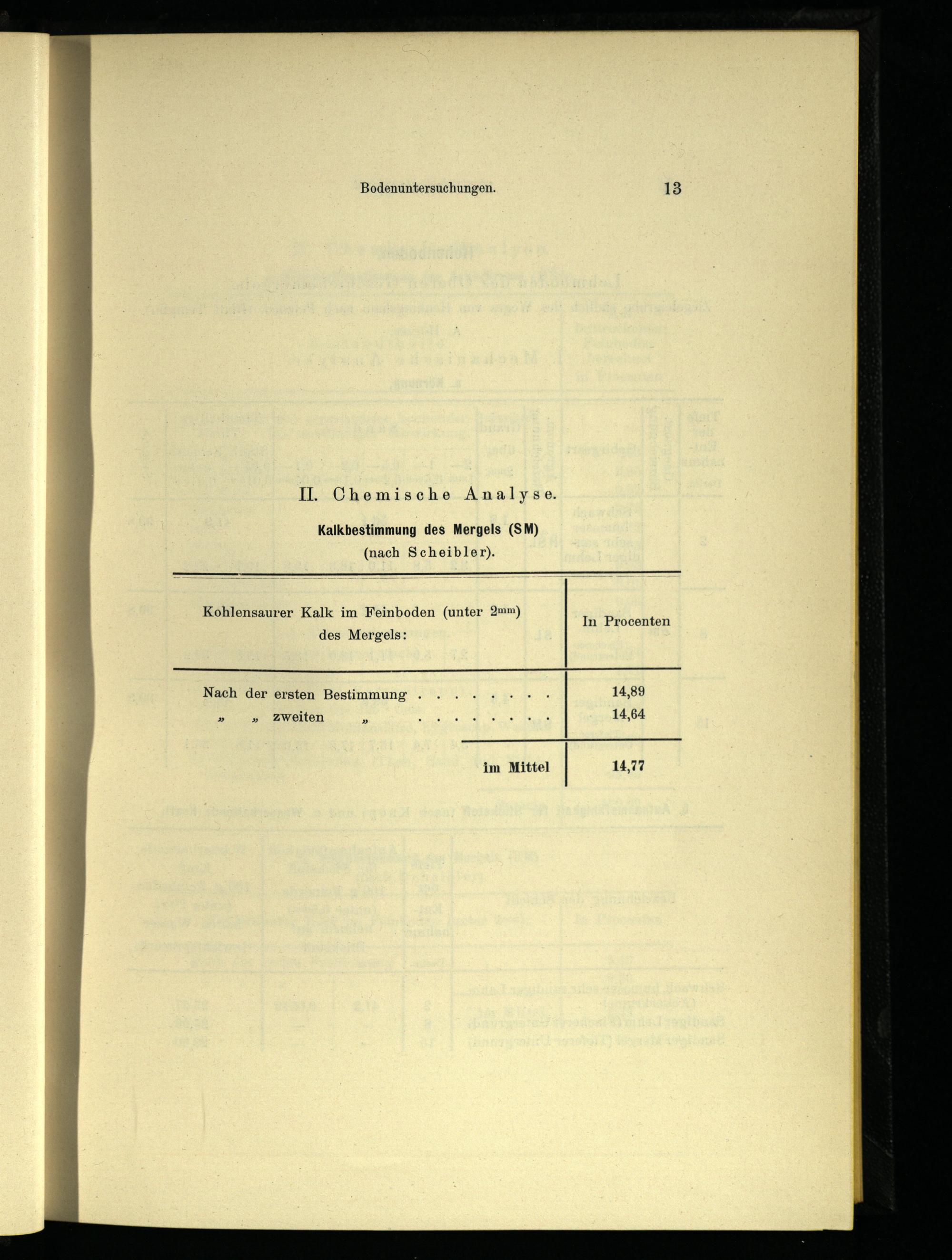 Bodenuntersuchungen. 13 N. Chemische Analyse. Kalkbestimmung des Mergels(SM) (nach Scheibler). Kohlensaurer Kalk im Feinboden(unter 2mm) In Procenten des Mergels: U 14,64 Nach der ersten Bestimmung....+++. 14,89 »» ZWeiten».. wu an im Mittel 14,77