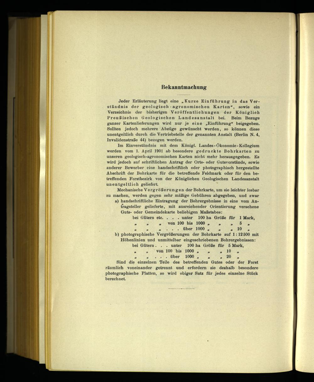 Im Einverständnis mit dem Königl. Landes- Ökonomie- Kollegium werden vom 1. April 1901 ab besondere gedruckte Bohrkarten zu unseren geologisch-agronomischen Karten nicht mehr herausgegeben. Es wird jedoch auf schriftlichen Antrag der Orts- oder Gutsvorstände, sowie anderer Bewerber eine handschriftlich oder photographisch hergestellte Abschrift der Bohrkarte für die betreffende Feldmark oder für den betreffenden Forstbezirk von der Königlichen Geologischen Landesanstalt unentgeltlich geliefert. X
