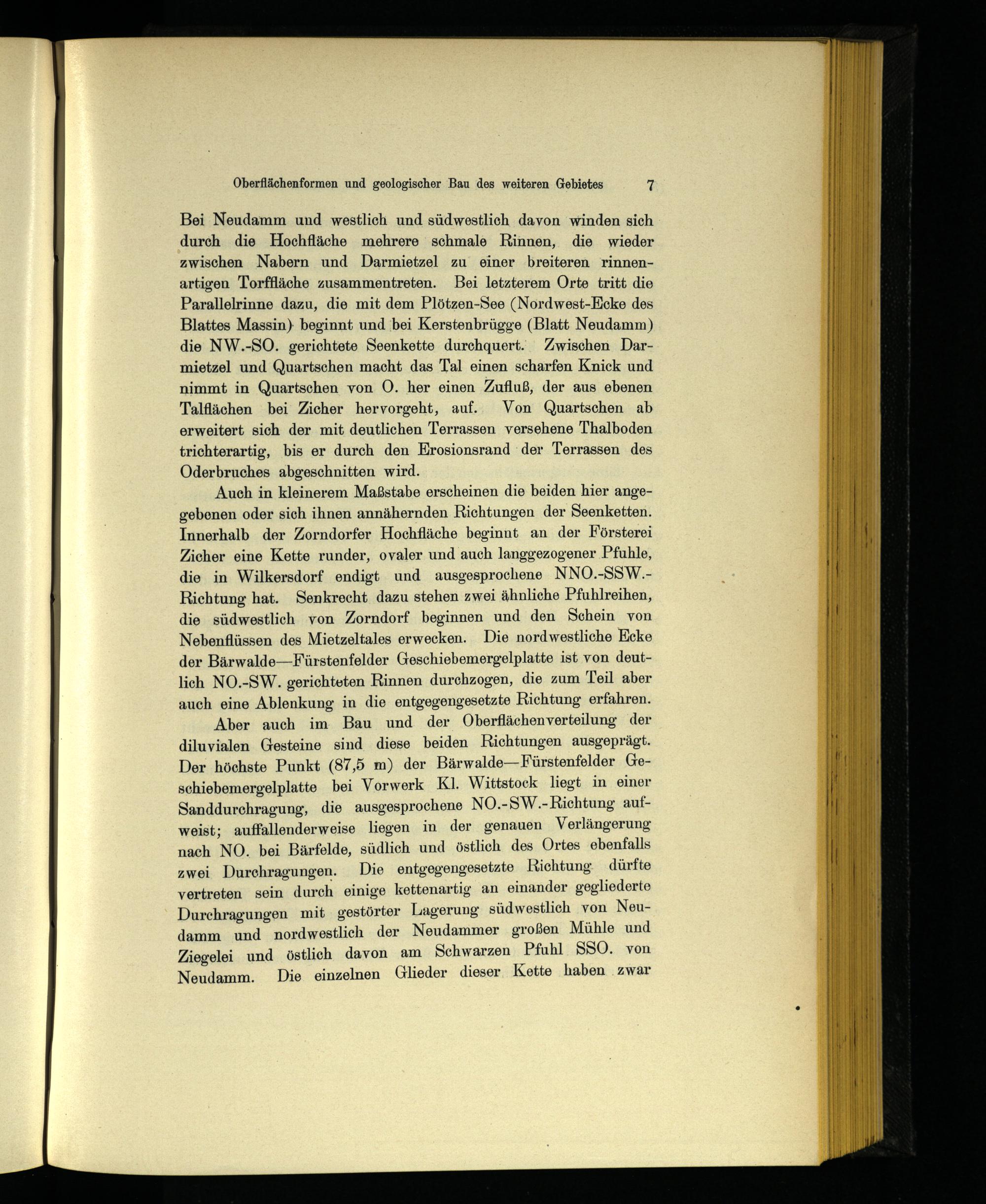 Auch in kleinerem Maßstabe erscheinen die beiden hier angegebenen oder sich ihnen annähernden Richtungen der Seenketten. Innerhalb der Zorndorfer Hochfläche beginnt an der Försterei Zicher eine Kette runder, ovaler und auch langgezogener Pfuhle, die in Wilkersdorf endigt und ausgesprochene NNO.-SSW.Richtung hat. Senkrecht dazu stehen zwei ähnliche Pfuhlreihen, die südwestlich von Zorndorf beginnen und den Schein von Nebenflüssen des Mietzeltales erwecken. Die nordwestliche Kicke der Bärwalde—Fürstenfelder Geschiebemergelplatte ist von deutlich NO.-SW. gerichteten Rinnen durchzogen, die zum Teil aber auch eine Ablenkung in die entgegengesetzte Richtung erfahren.