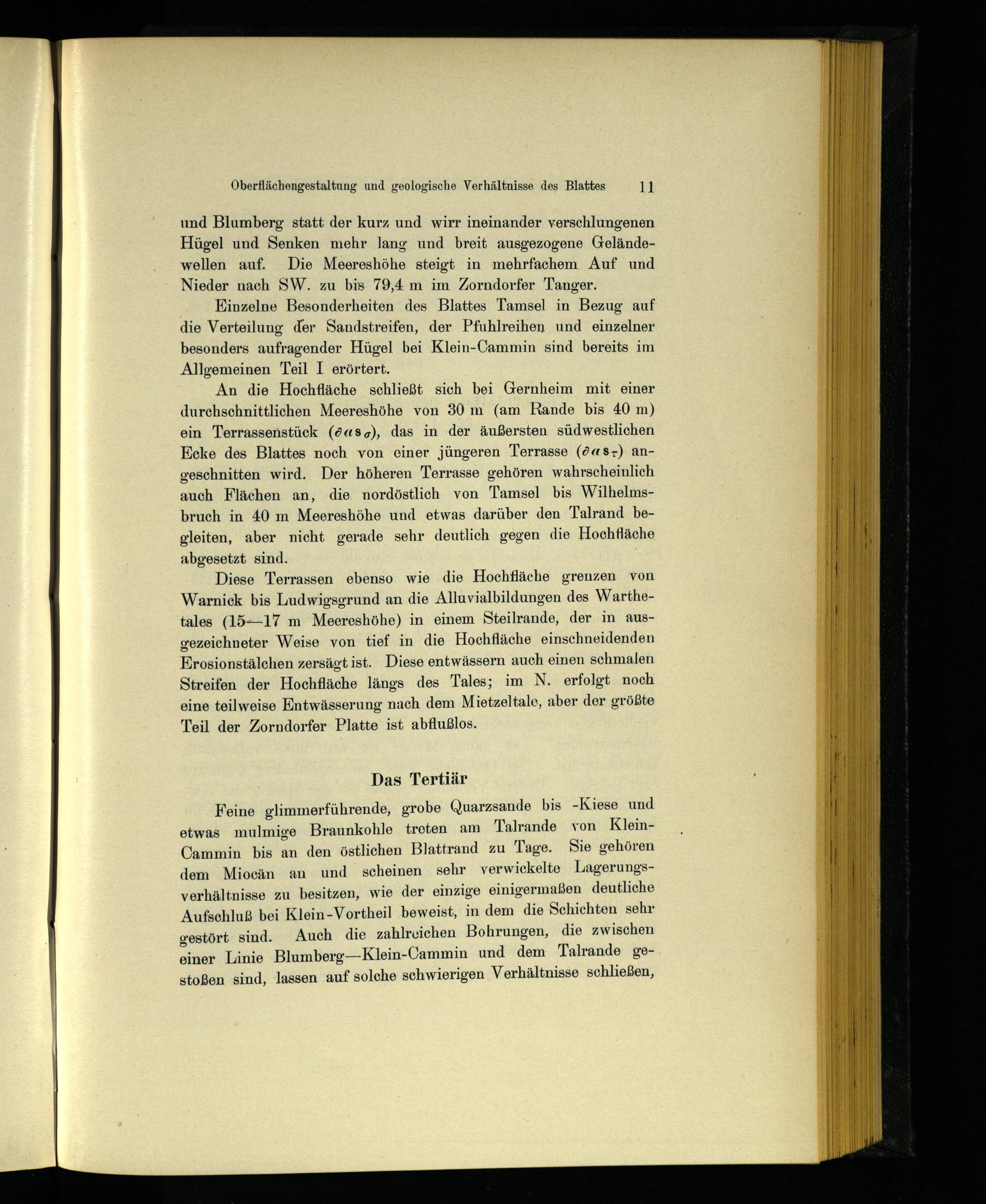 Feine glimmerführende, grobe Quarzsande bis-Kiese und etwas mulmige Braunkohle treten am Talrande von KleinCammin bis an den östlichen Blattrand zu Tage. Sie gehören dem Miocän an und scheinen sehr verwickelte Lagerungsverhältnisse zu besitzen, wie der einzige einigermaßen deutliche Aufschluß bei Klein-Vortheil beweist, in dem die Schichten sehr gestört sind. Auch die zahlreichen Bohrungen, die zwischen einer Linie Blumberg —Klein-Cammin und dem Talrande ge