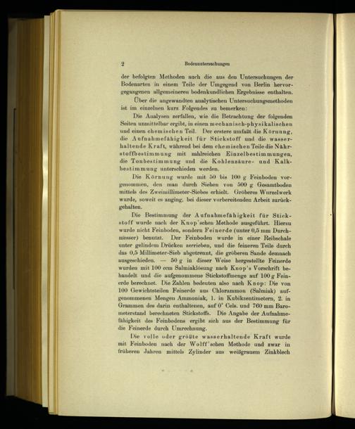 Die Analysen zerfallen, wie die Betrachtung der folgenden Seiten unmittelbar ergibt, in einen mechanisch-physikalischen und einen chemischen Teil. Der erstere umfaßt die Körnung, die Aufnahmefähigkeit für Stickstoff und die wasserhaltende Kraft, während bei dem chemischen Teile die Nährstoffbestimmung mit zahlreichen Einzelbestimmungen, die Tonbestimmung und die Kohlensäure- und Kalkbestimmung unterschieden werden.
