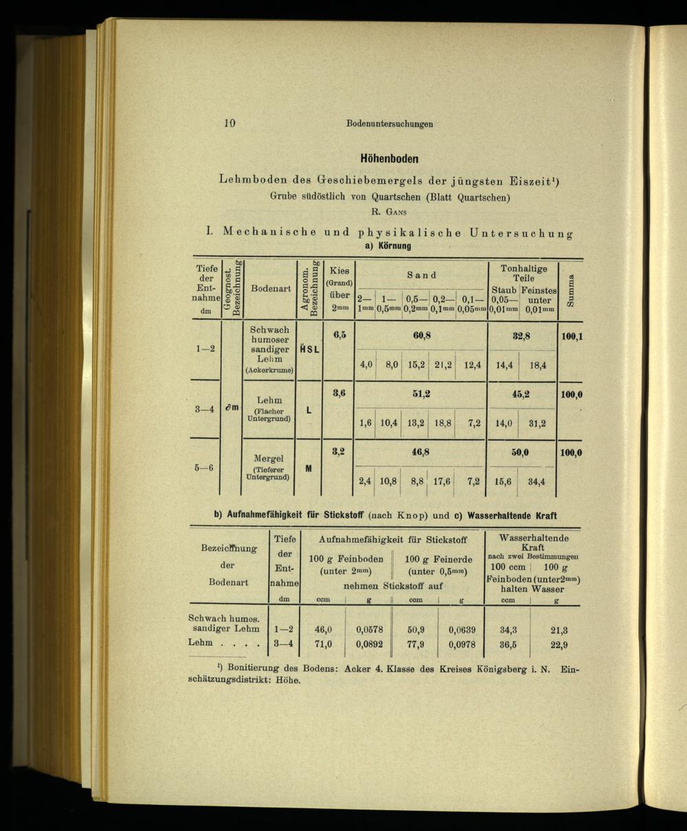 b) Aufnahmefähigkeit für Stickstoff(nach Knop) und c) Wasserhaltende Kraft