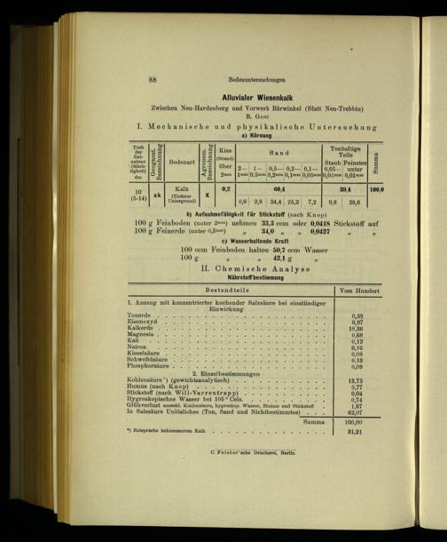 Hygroskopisches Wasser bei 105% Cels.. Glüh verlust ausschl. Kohlensäure, hygroskop. Wasser, Homus und Stickstoff In Salzsäure Unlösliches(Ton, Sand und Nichtbestimmtes)