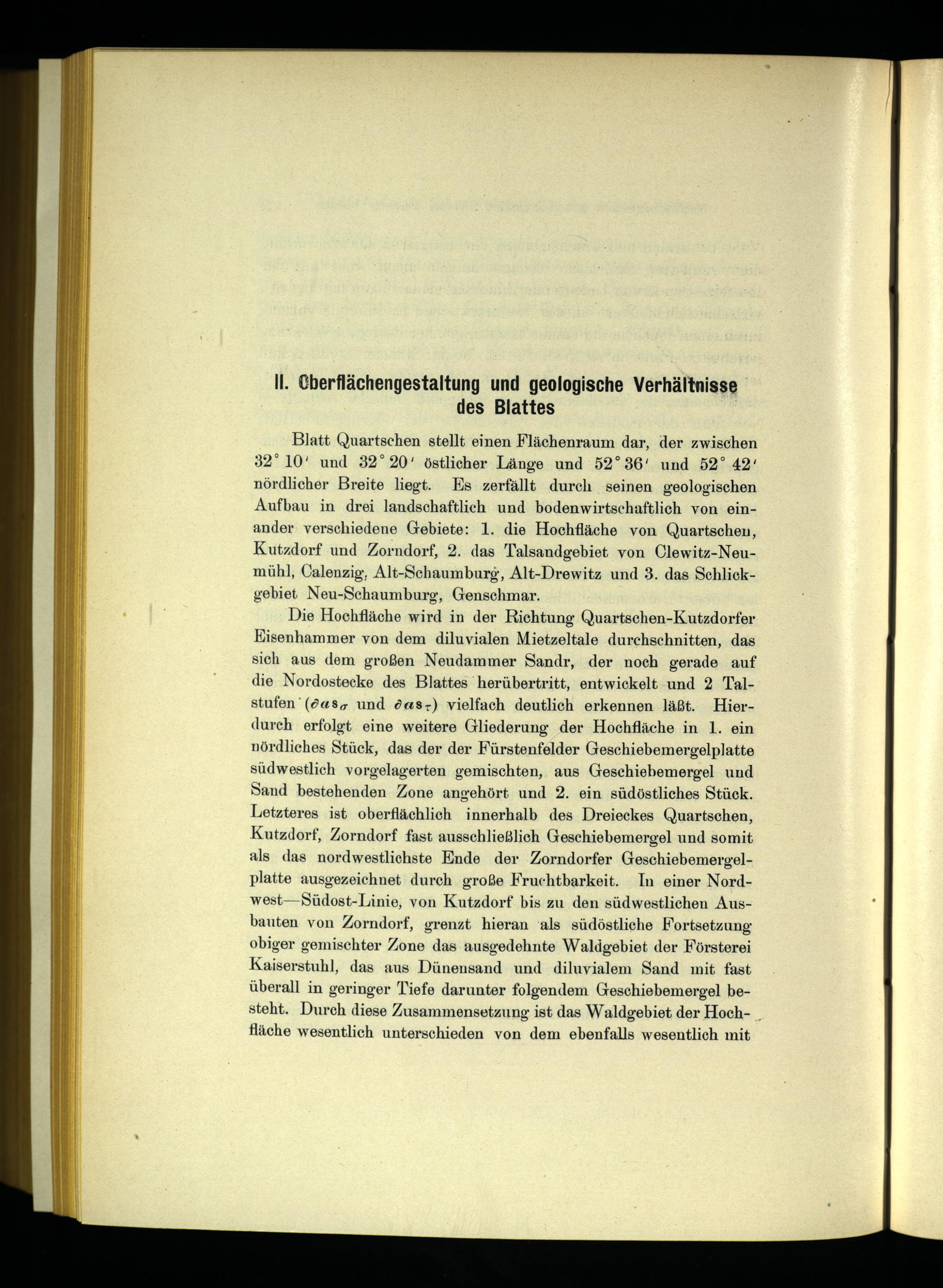 Die Hochfläche wird in der Richtung Quartschen-Kutzdorfer Eisenhammer von dem diluvialen Mietzeltale durchschnitten, das sich aus dem großen Neudammer Sandr, der noch gerade auf die Nordostecke des Blattes herübertritt, entwickelt und 2 Talstufen(dxs7 und das-) vielfach deutlich erkennen läßt. Hierdurch erfolgt eine weitere Gliederung der Hochfläche in 1. ein nördliches Stück, das der der Fürstenfelder Geschiebemergelplatte südwestlich vorgelagerten gemischten, aus Geschiebemergel und Sand bestehenden Zone angehört und 2. ein südöstliches Stück. Letzteres ist oberflächlich innerhalb des Dreieckes Quartschen, Kutzdorf, Zorndorf fast ausschließlich Geschiebemergel und somit als das nordwestlichste Ende der Zorndorfer Geschiebemergelplatte ausgezeichnet durch große Fruchtbarkeit. In einer Nordwest—Südost-Linie, von Kutzdorf bis zu den südwestlichen Ausbauten von Zorndorf , grenzt hieran‘als südöstliche Fortsetzung obiger gemischter Zone das ausgedehnte Waldgebiet der Försterei Kaiserstuhl , das aus Dünensand und diluvialem Sand mit fast überall in geringer Tiefe darunter folgendem Geschiebemergel besteht. Durch diese Zusammensetzung ist das Waldgebiet der Hoch-_ fläche wesentlich unterschieden von dem ebenfalls wesentlich mit