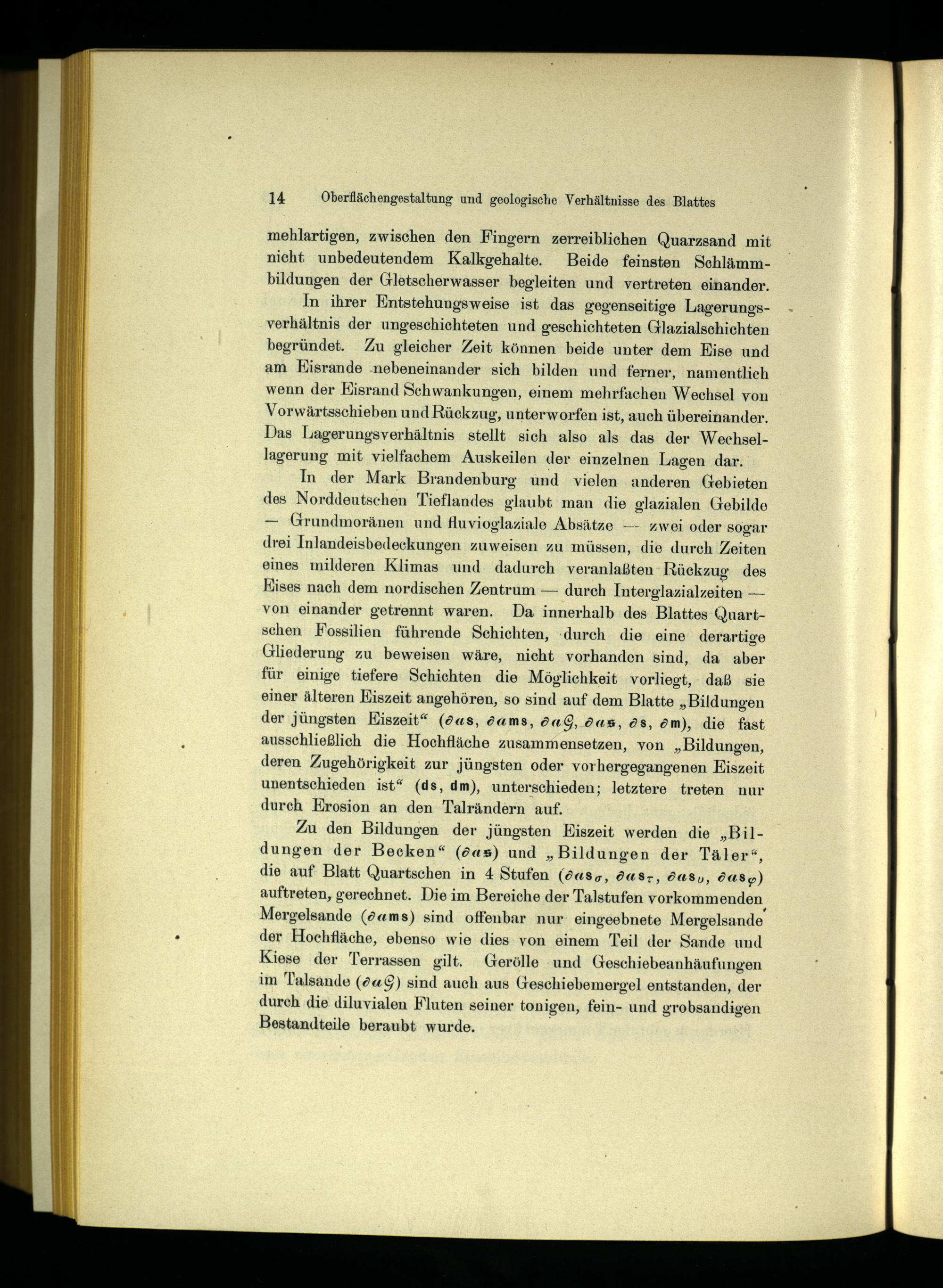 In der Mark Brandenburg und vielen anderen Gebieten des Norddeutschen Tieflandes glaubt man die glazialen Gebilde — Grundmoränen und fluvioglaziale Absätze— zwei oder sogar drei Inlandeisbedeckungen zuweisen zu müssen, die durch Zeiten eines milderen Klimas und. dadurch veranlaßten Rückzug des Kises nach dem nordischen Zentrum— durch Interglazialzeiten— von einander getrennt waren. Da innerhalb des Blattes Quart schen Fossilien führende Schichten, ‚durch die eine derartige Gliederung zu beweisen wäre, nicht vorhanden sind, da aber für einige tiefere Schichten die Möglichkeit vorliegt, daß sie einer älteren Eiszeit angehören, so sind auf dem Blatte„Bildungen der jüngsten Eiszeit“(ö«s, dams, daG, das, Ö8, öm), die fast ausschließlich die Hochfläche zusammensetzen, yon„Bildungen, deren Zugehörigkeit zur jüngsten oder vorhergegangenen Eiszeit unentschieden ist“(ds, dm), unterschieden; letztere treten nur durch Erosion an den Talrändern auf.