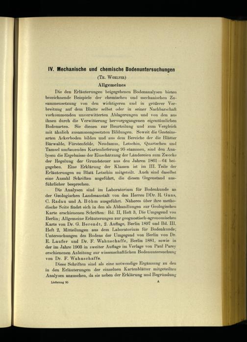Die Analysen sind im Laboratorium für Bodenkunde an der Geologischen Landesanstalt von den Herren DDr. R. Gans, C. Radau und A. Böhm ausgeführt. Näheres über ihre methodische Seite findet sich in den als Abhandlungen zur Geologischen Karte erschienenen Schriften: Bd. II, Heft 3, Die Umgegend von Berlin; Allgemeine Erläuterungen zur geognostisch-agronomischen Karte von Dr. G. Berendt, 2. Auflage, Berlin 1897 und Bd. III, Heft 2, Mitteilungen aus dem Laboratorium für Bodenkunde; Untersuchungen des Bodens der Umgegend von Berlin von Dr. E. Laufer und Dr. F. Wahnschaffe, Berlin 1881, sowie in der im Jahre 19038 in zweiter Auflage im Verlage von Paul Parey erschienenen Anleitung zur wissenschaftlichen Bodenuntersuchung von Dr. F. Wahnschaffe.