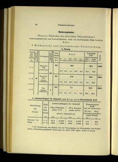 n 7 9&0 T ES 7 WTA. Tiefe|£ a: Tonhaltige der[35 E Ss a Sand 3 Teile S Ent- ES Gebirgsart| 5£ 6 HG TTT T————— Staub Keinstes IS] nahme] 83| ra 1— 10,5—' 0,3 0,1—[0,05—/ unter| S dm TS 75 22mm mm 0,5mm 0,2mm 0,1mm 0,05mm 0,01mm 0,01mm Humoler 0,0 16,8 83,2 100,0 0—1 Ton TO 1 a Fon en a r" TR (Ackerkrume) 0,0| 0,2| 1,0| 9,2| 6,4| 104 72,8 — HT— HELL N Hümoser 0,0 17,0 83,0 100,0 Fl|| Usiergrang) 0,0| 0,2 0,8| 10,8| 5,2| 9,2| 788 |||| — HE AA VE 0,0 77 92,3 100,0 Ton ö—6(Tieferer T ST ET TE Tolrerund) 0,0| 0,0| 0,1| 1,0| 6,6| 28,8| 68,5 |||