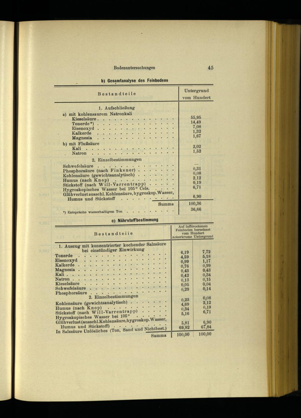 a) mit kohlensaurem Natronkali Kieselsäufe re Me ee 55,95 Tonerde”*).; 2.0.0.0 HH nn 14,49 Hisenoxyd.. 0 2 tn nn 7,08 Kalkerde 2... 2... 0 en 1,82 Magnesia. 0. HN 1,67 b) mit Flußsäure Kali 1 N 2,02 Natron. NN lH 1,52 2, Einzelbestimmungen Schwefelsäure... 0.0.00 000 HH Phosphorsäure(nach Finkener)....+.“ 0,31 Kohlensäure(gewichtsanalytisch). 0,08 Humus(nach Knop)= 00 HH 2,12 Stickstoff(nach Will-Varrentrapp)... 0,19 Hygroskopisches Wasser bei 105% Cels;:..% 6,71 Glühverlust ausschl. Kohlensäure, hygroskop. Wasser, Humus und Stickstoff. Ce a 6,90 Summa 100,36
