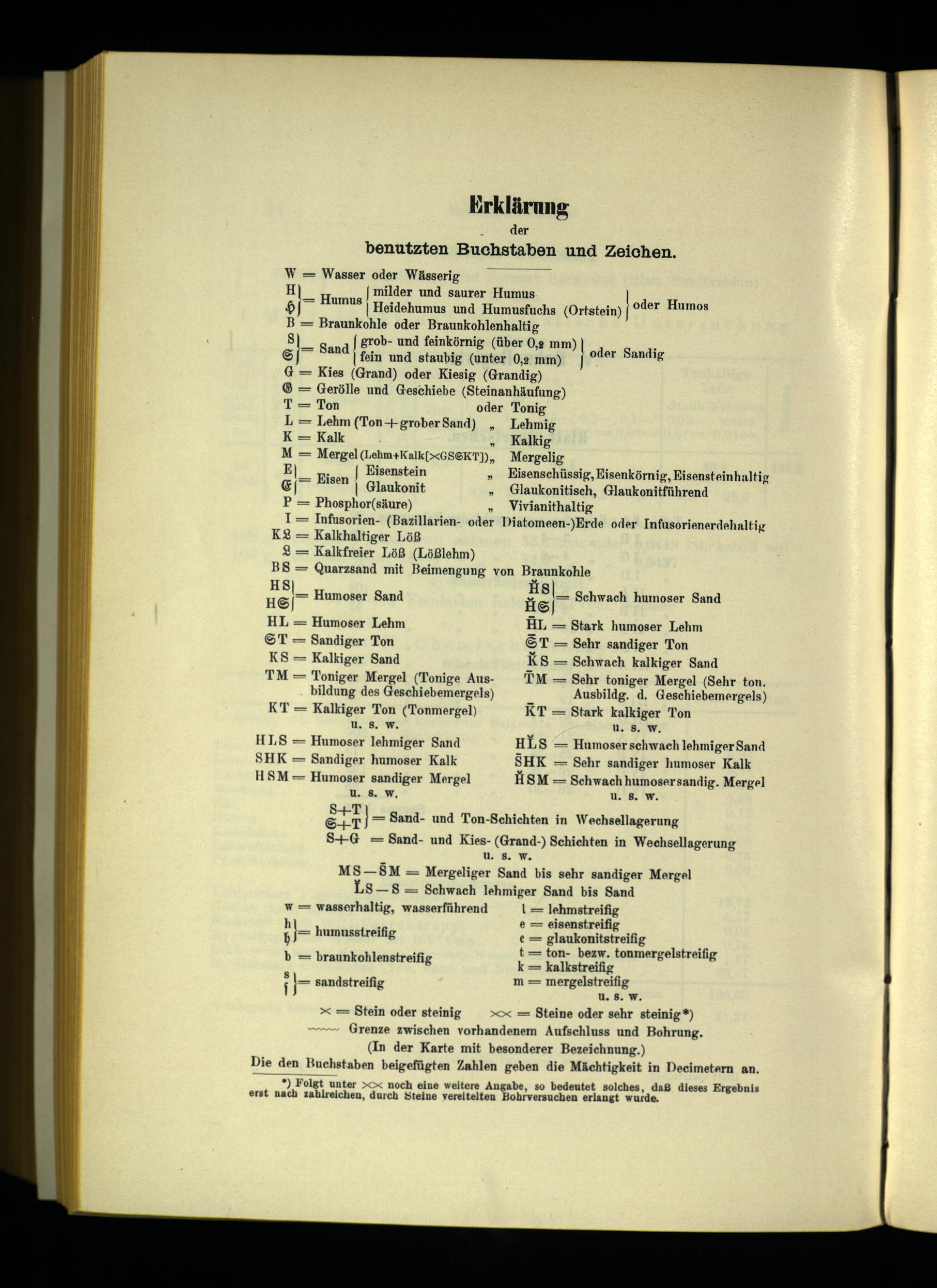 x= Stein oder steinig>>== Steine oder sehr steinig*) Grenze zwischen vorhandenem Aufschluss und Bohrung. (In der Karte mit besonderer Bezeichnung.) Die den Buchstaben beigefügten Zahlen geben die Mächtigkeit in Decimetern an.